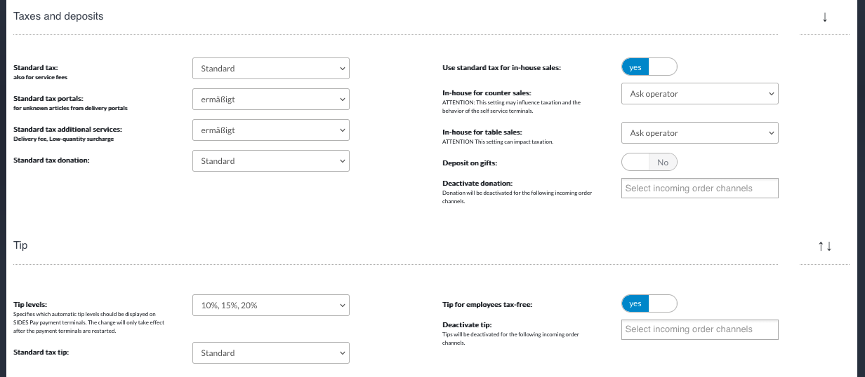 Tip levels: Determines which automatic tip levels should be displayed at SIDES Pay terminals. The change will only take effect after the terminals are restarted.