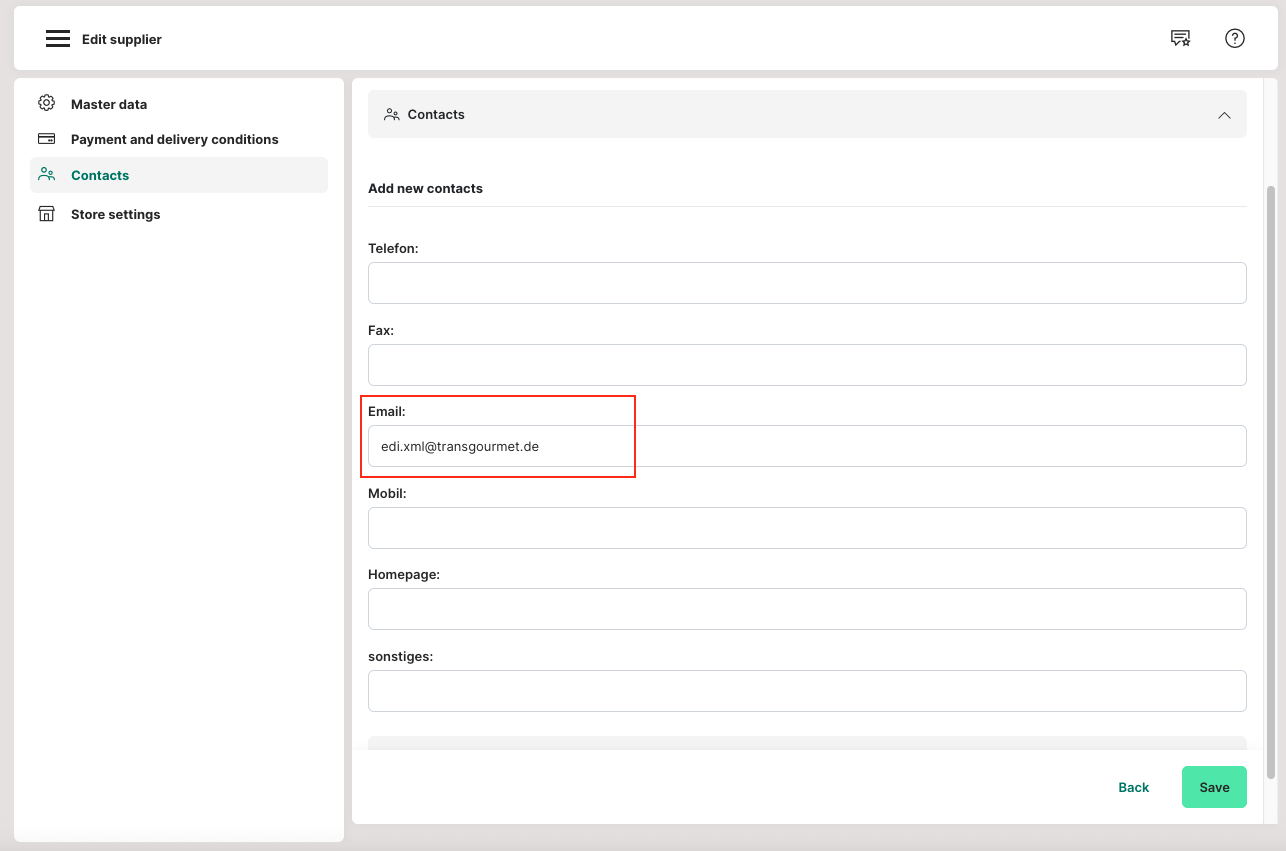 For Transgourmet, please enter the following email address: edi.xml@transgourmet.de . Please remember that for order processing to be successful, the "openTrans-XML" format must also be selected in the "Master data" section.