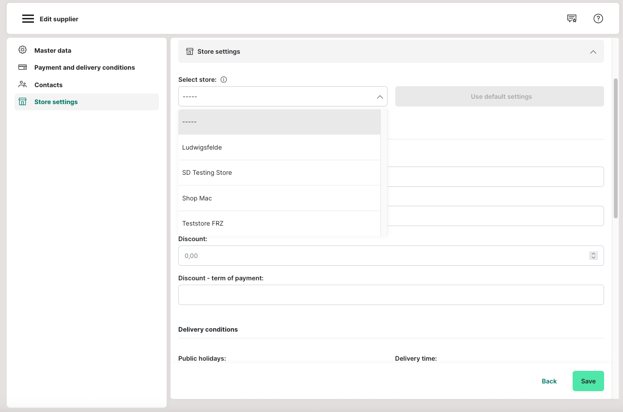 Store settings: If you have more than one store, you can enter individual delivery and discount information. However, the default settings in the "Payment and delivery conditions" section must be configured first. Select a store from the dropdown menu and enter the information. Click "Save" to finish. Electronic delivery can also be enabled here.