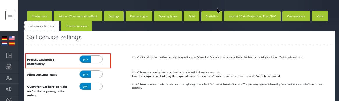The immediate processing of paid self-ordering terminal orders can be activated in the administration area.