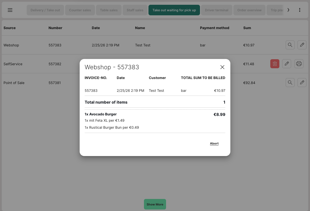 Takeout orders waiting for pickup from webshop or POS and self-ordering terminal (SOT)