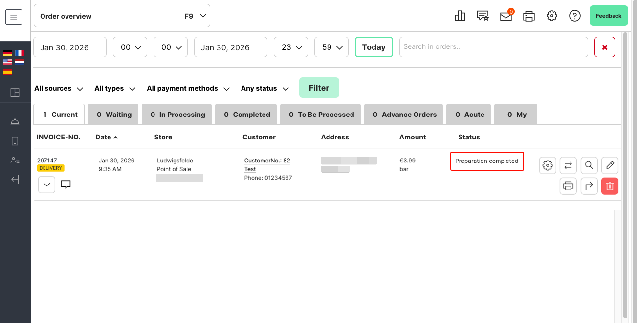 As soon as an order is marked as "Ready" in the kitchen manager, the POS shows the status "Preparation completed" and the system automatically sends a status update to Wolt, so that the order is displayed as completed there.