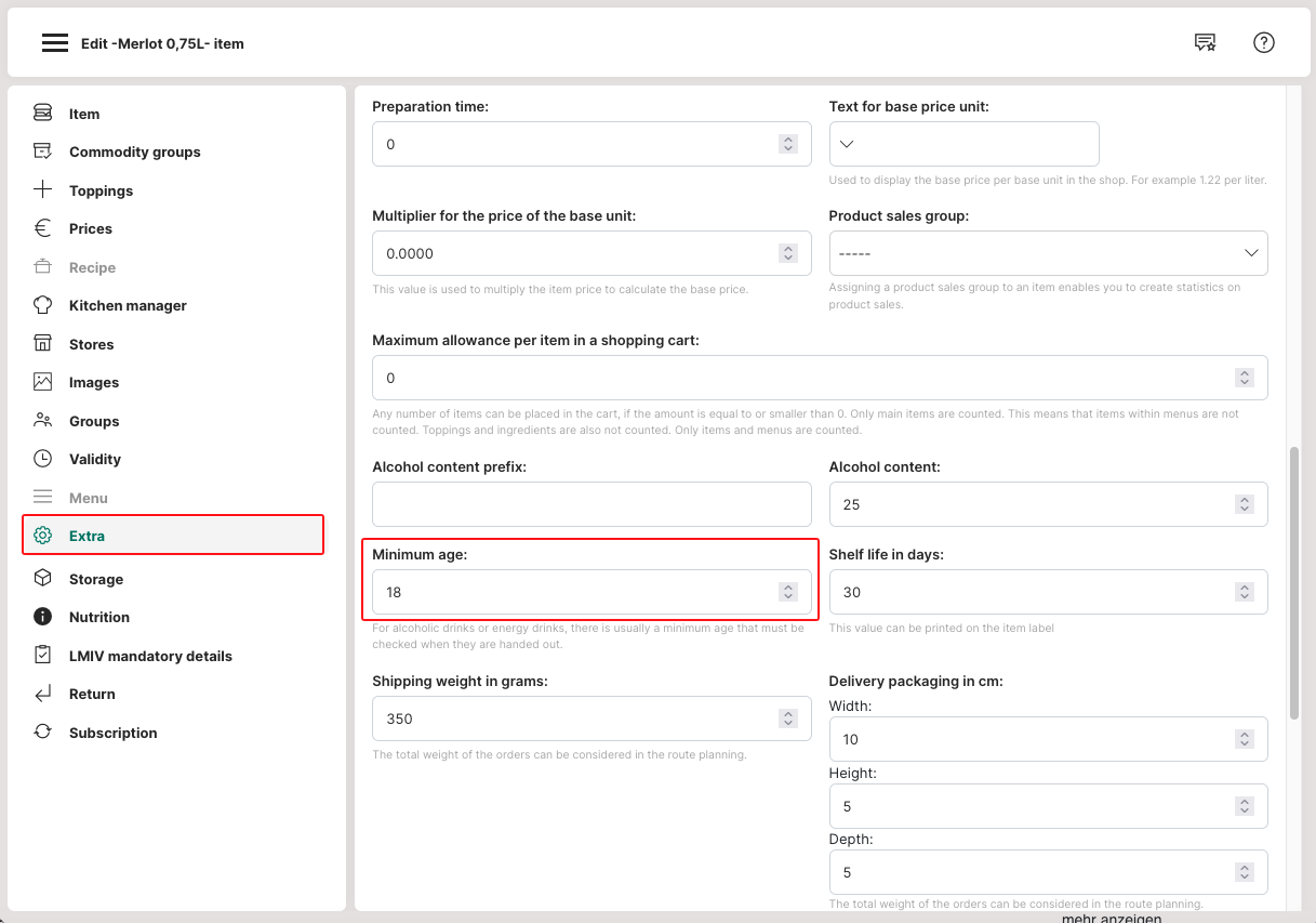 - Wolt courier will automatically get a notification to check the ID of the customer if the order contains products with alcohol. To do this, all the products that require an age check need to have the age limit field in: Admin: Item management > Item > search for the item you want to add an age limit > press on "Edit" (the pencil logo) > Extra > Minimum age.