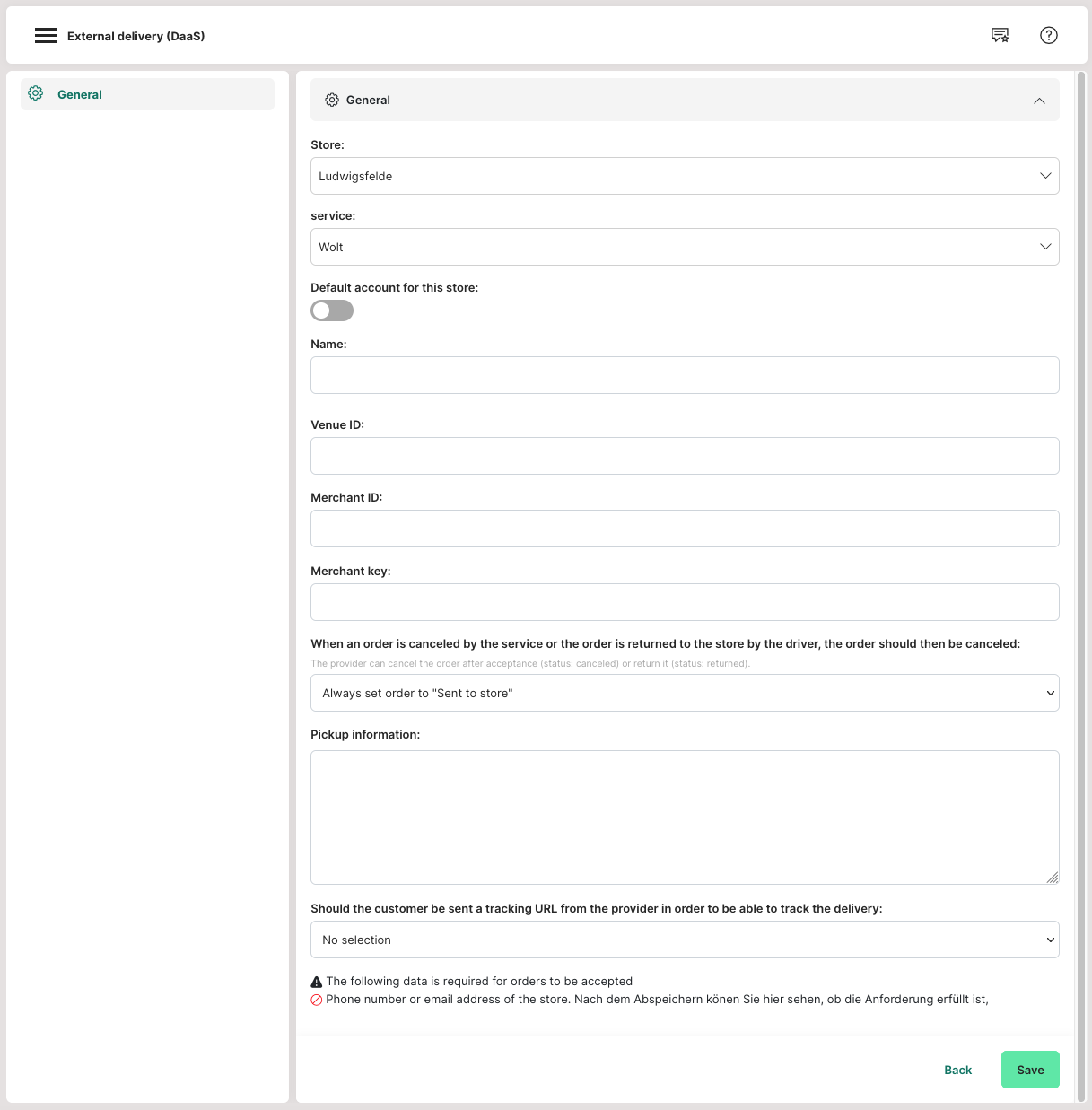 You will need credential information from Wolt Drive team. Please first reach out to them for all the needed info (Venue ID, Merchant ID, Merchant key). Merchant ID and Merchant key are the same for all the venues, but the venue ID should be unique for every store that you set up.