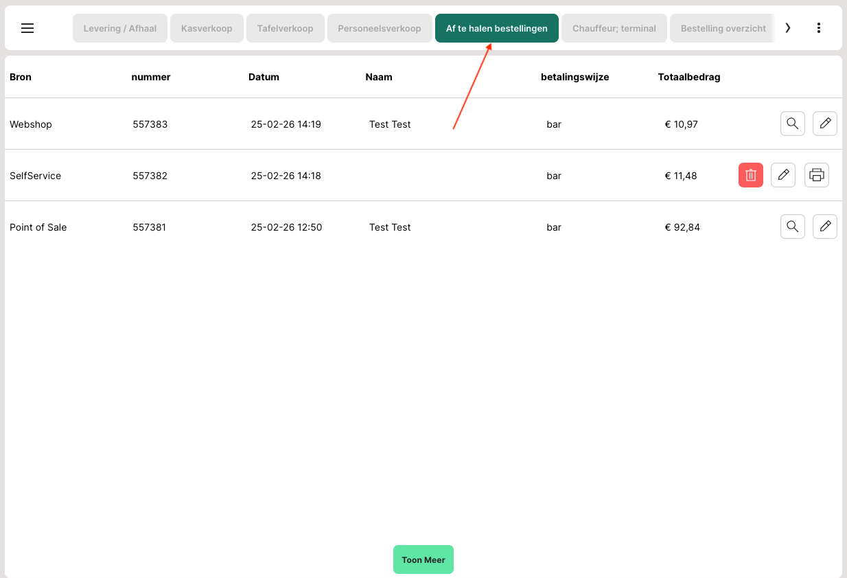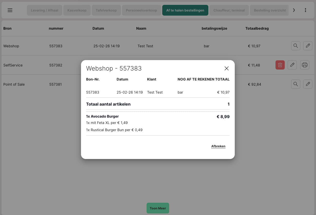 Af te halen bestellingen uit de webshop of kassa en de self-ordering-terminal (SOT)