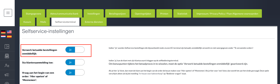 In het administratiegedeelte kan de directe verwerking van betaalde Self-Ordering Terminal-bestellingen worden ingeschakeld.