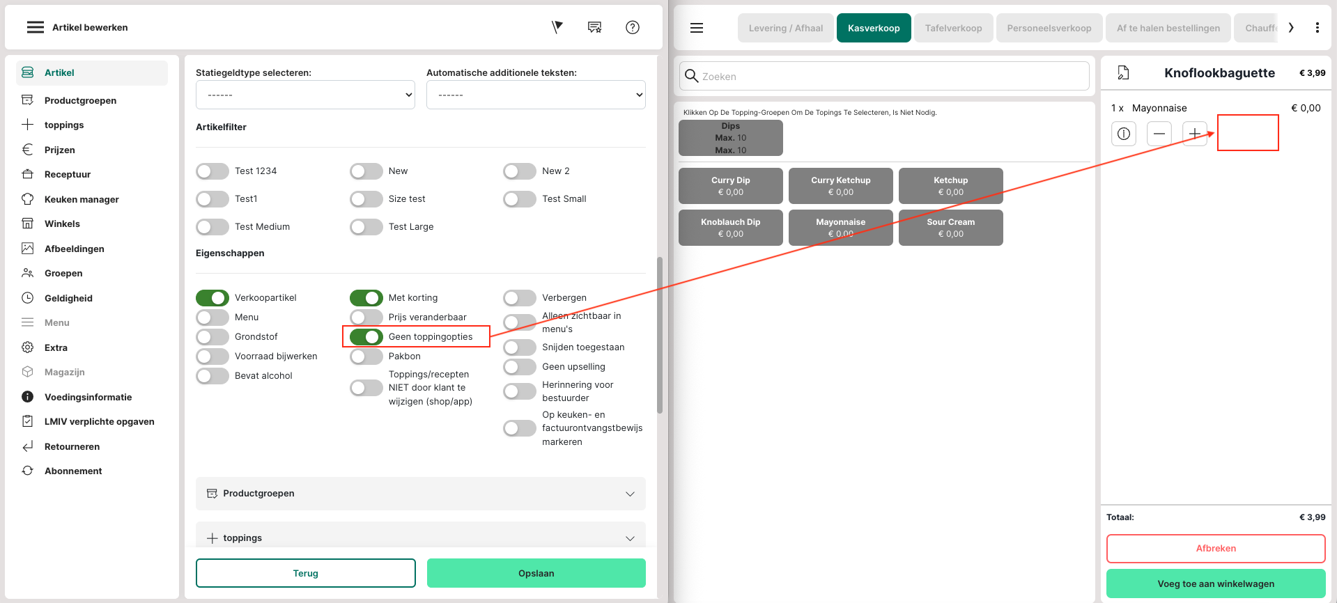 Verbergen: Indien geactiveerd wordt het artikel onzichtbaar in de webshop en in de app, maar blijft zichtbaar in de kassa.