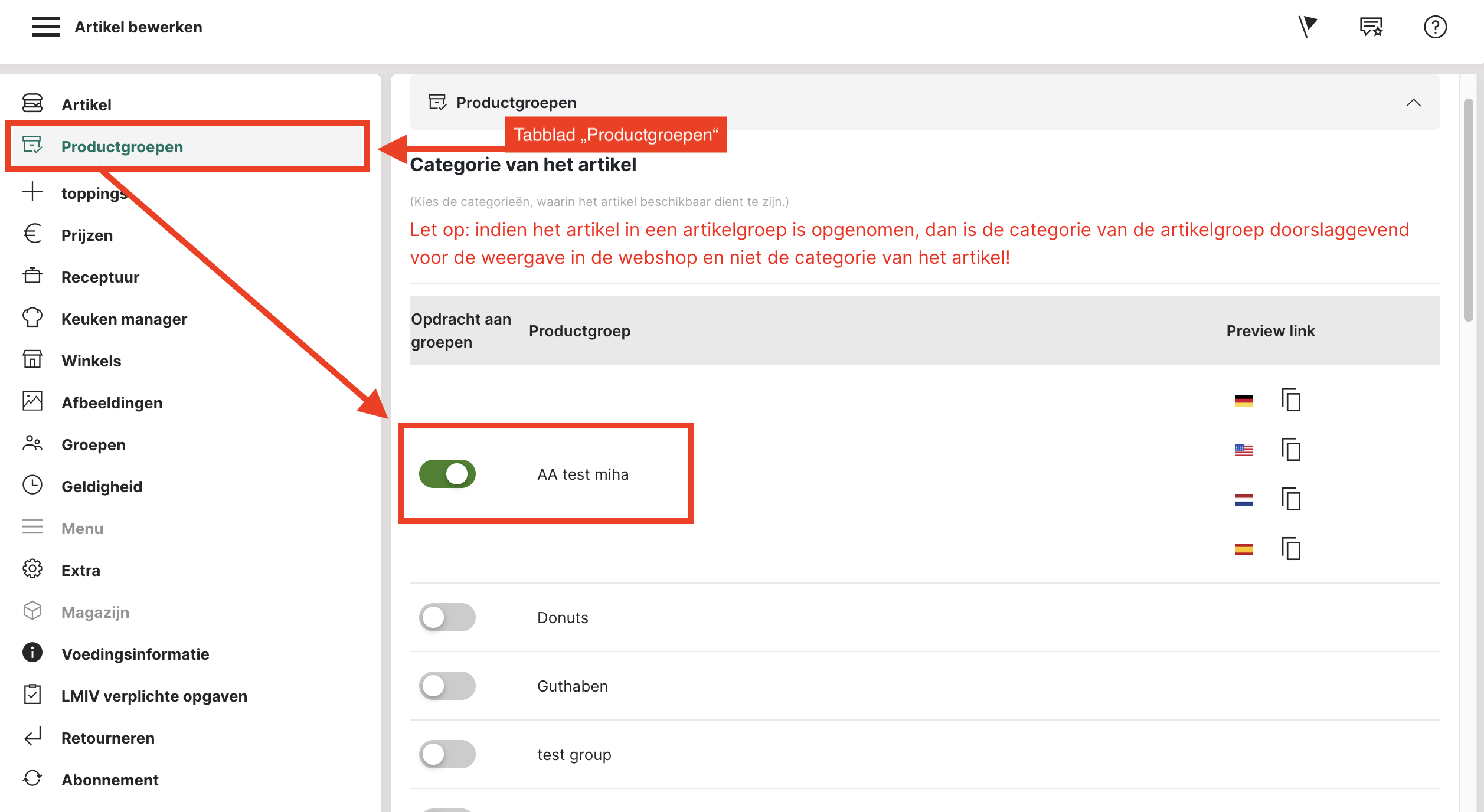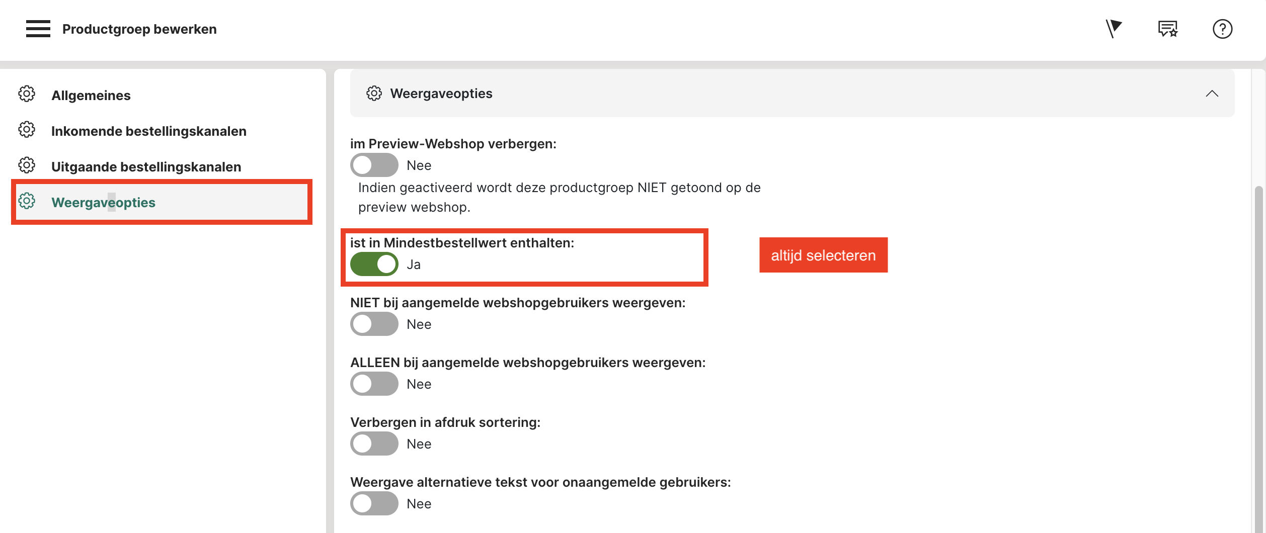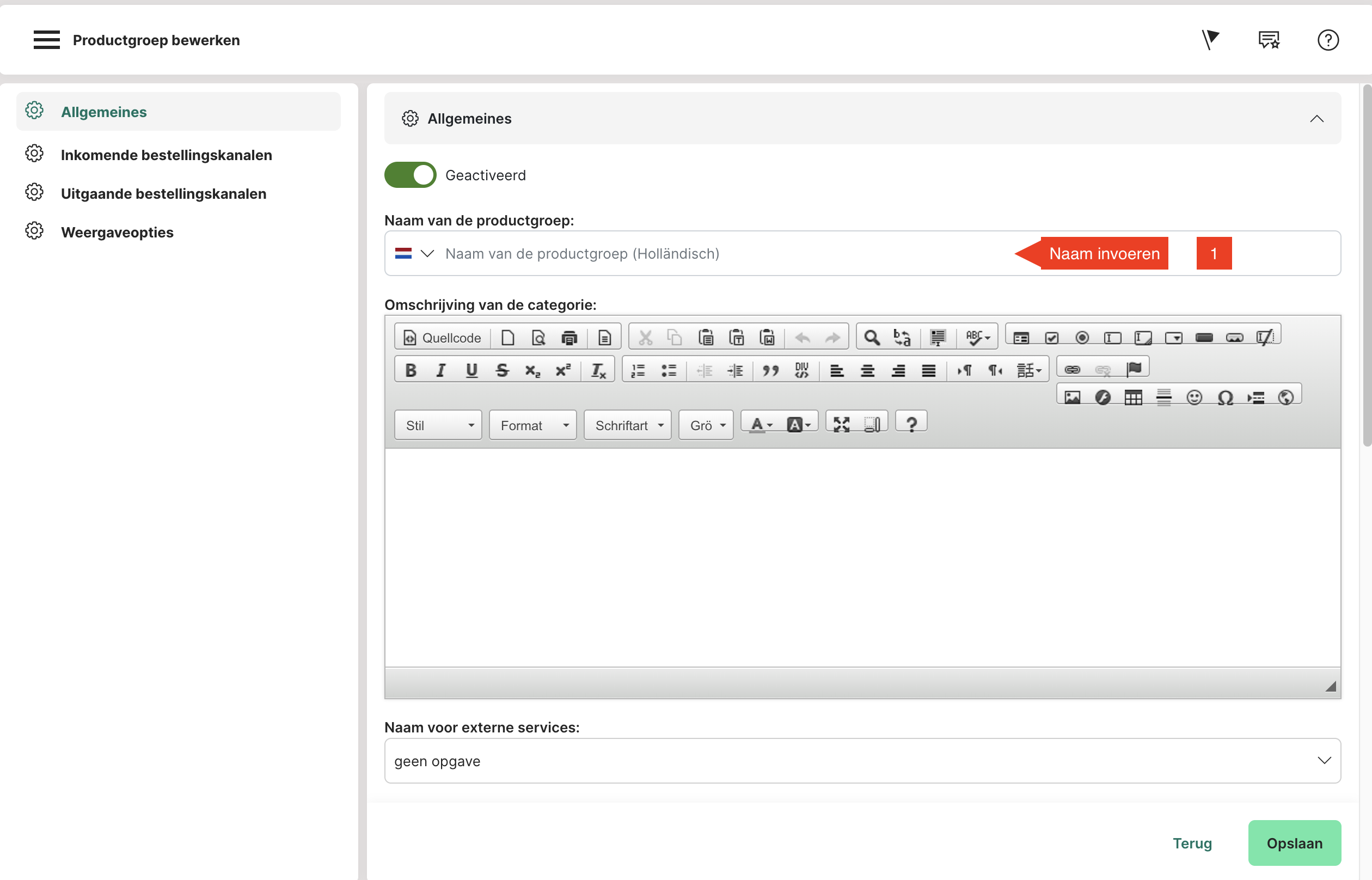 Actief: "Ja" is standaard geselecteerd en betekent dat de productgroep zichtbaar is.