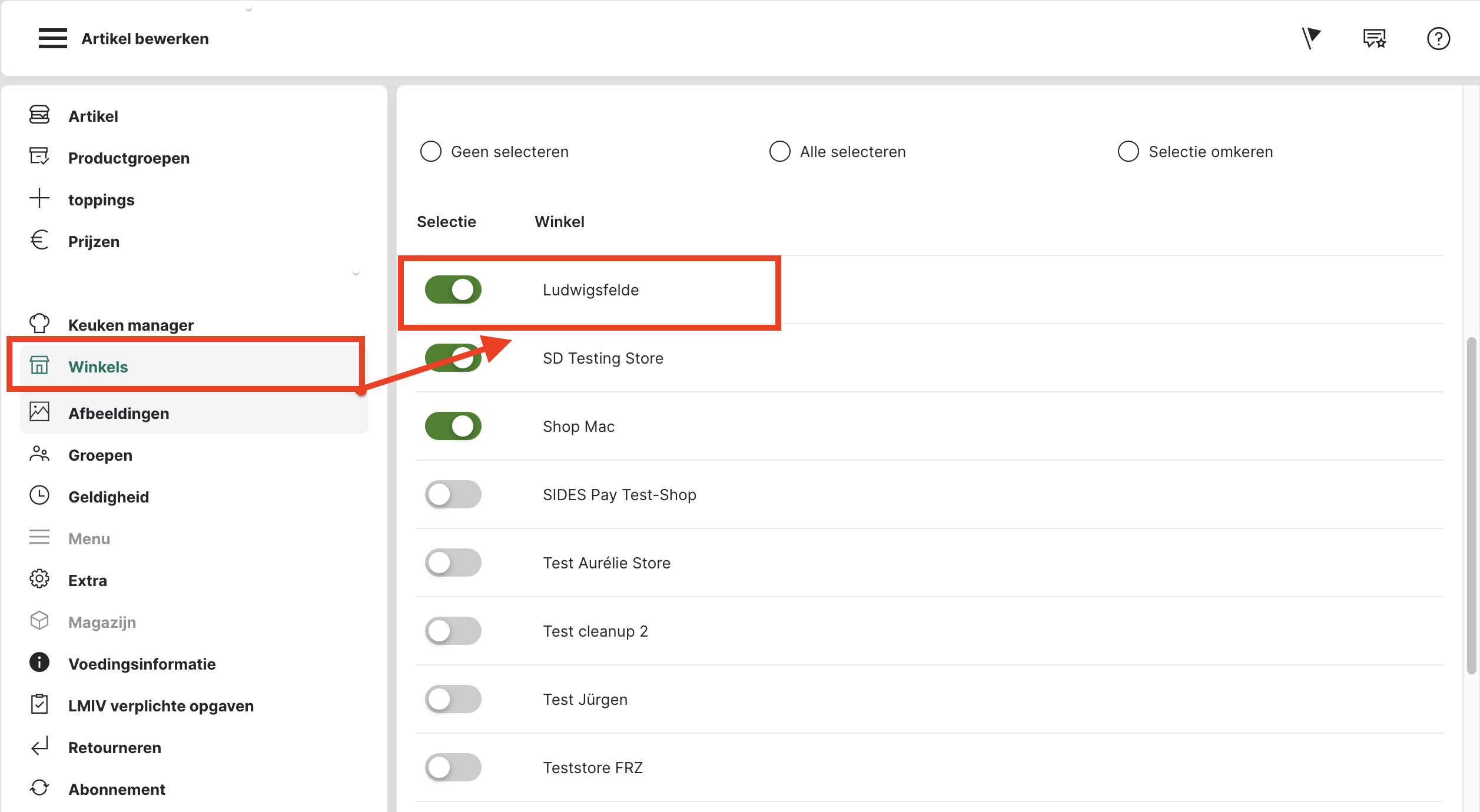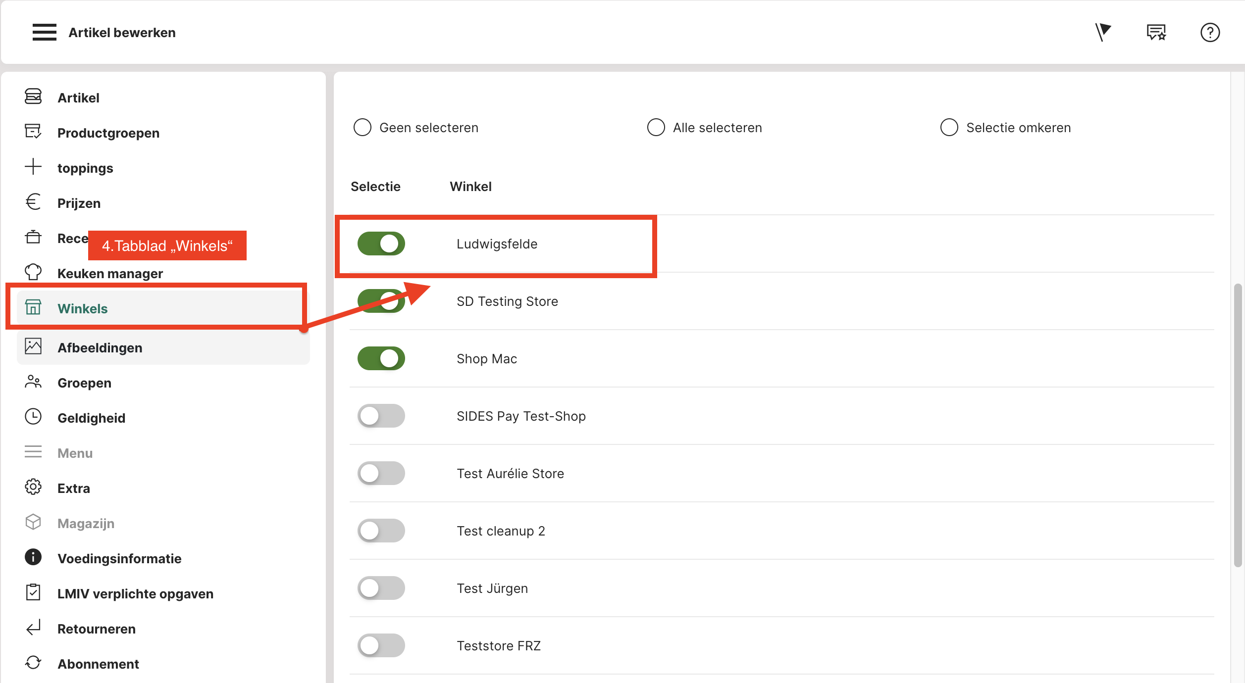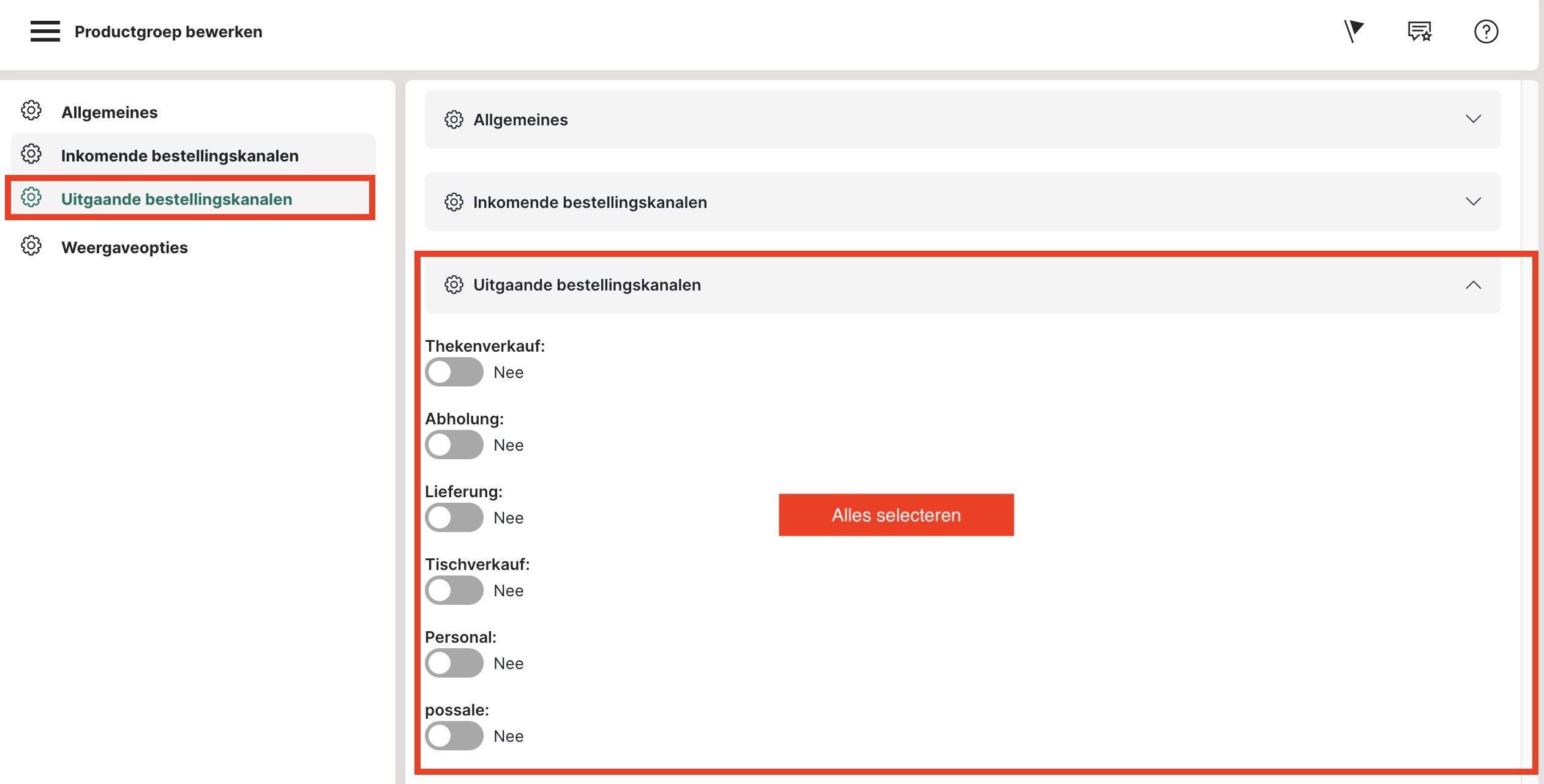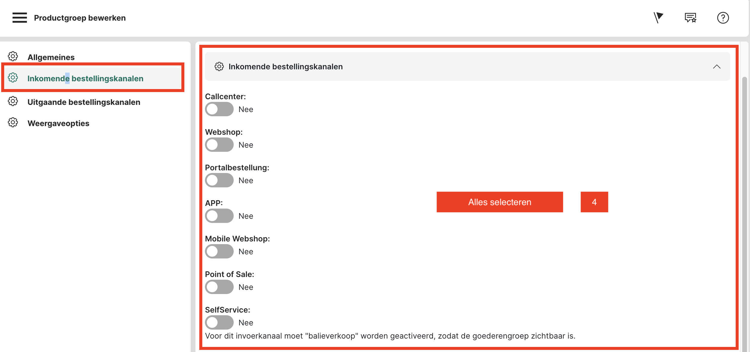 4. Inkomende bestellingskanalen + uitgaande bestellingskanalen: Hier wordt alles op "Ja" gezet en dus geactiveerd (stap 4). Tenzij je bijvoorbeeld niet levert, dan kun je de levering achterwege laten, maar anders schakel je alle kanalen in.