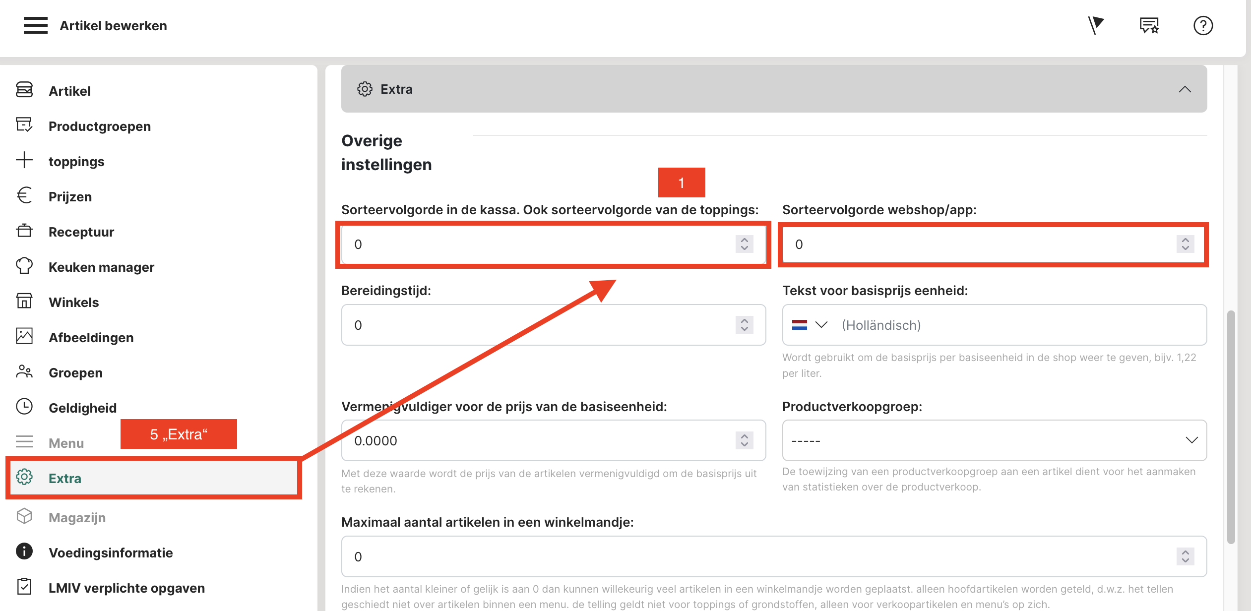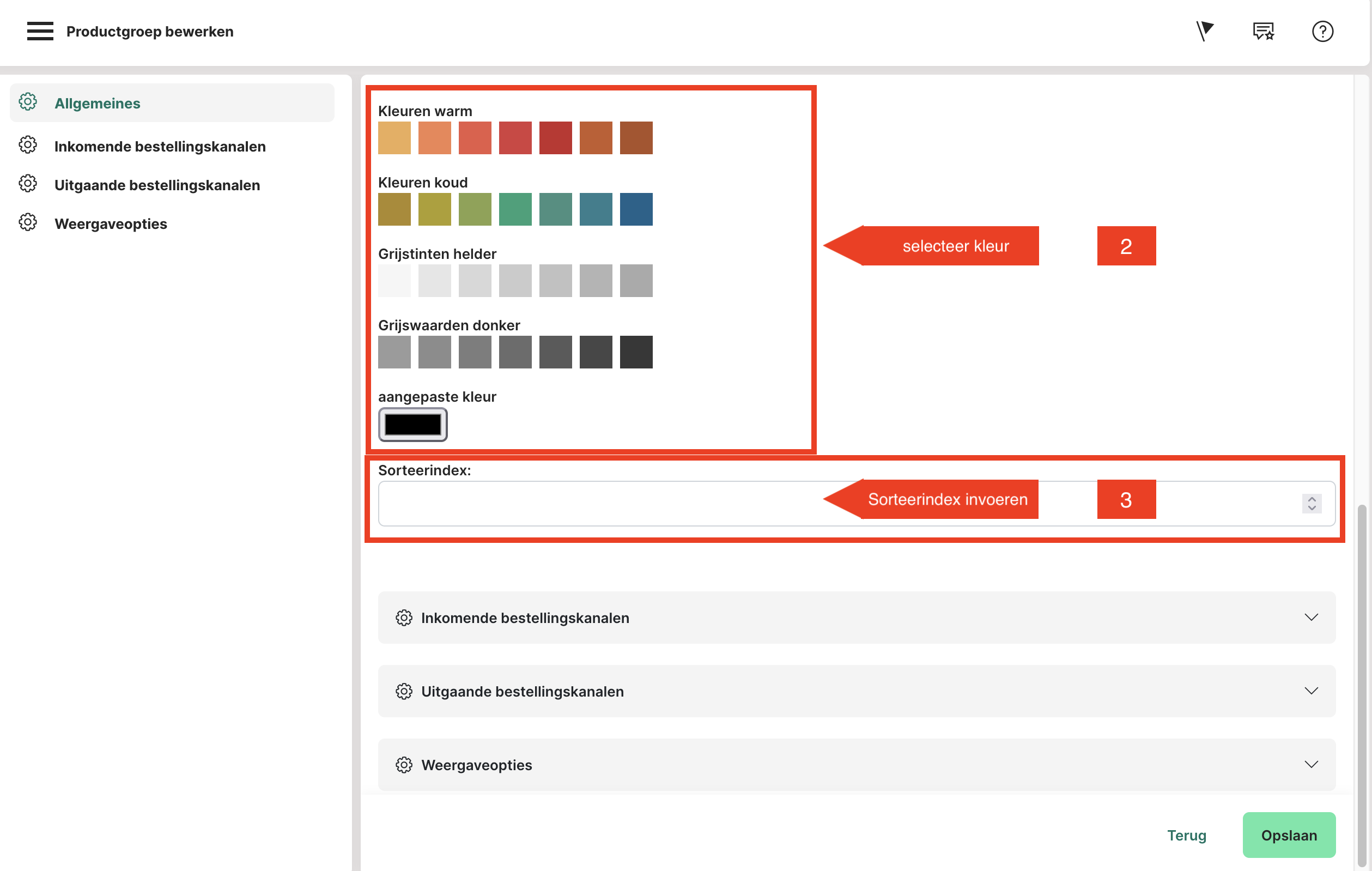 3. Sorteerindex: Voer een sorteerindex in (stap 3). Het is aan te raden om de sorteerindex te beginnen met een "5". We raden aan om de sorteervolgorde in stappen van 5 in te voeren, zodat er bij latere wijzigingen of aanpassingen een getal tussen kan worden gezet. Dit betekent dat de volgende productgroep het nummer "10" heeft, de volgende het nummer "15", enz.