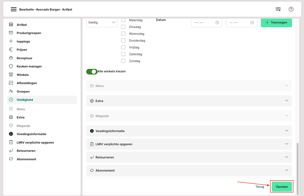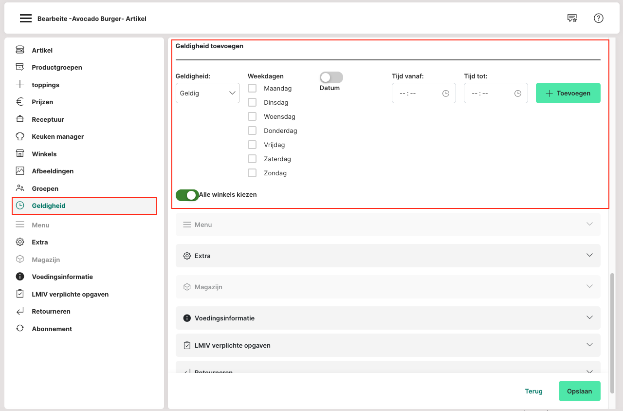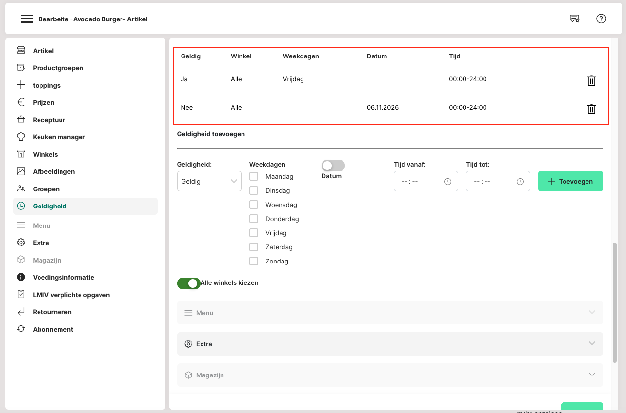 Onder Admin: Artikelen beheren > Artikel > Bewerken > sectie "Geldigheid" kunnen nieuwe regels worden aangemaakt via de knop "Toevoegen" en bestaande regels beheerd worden.