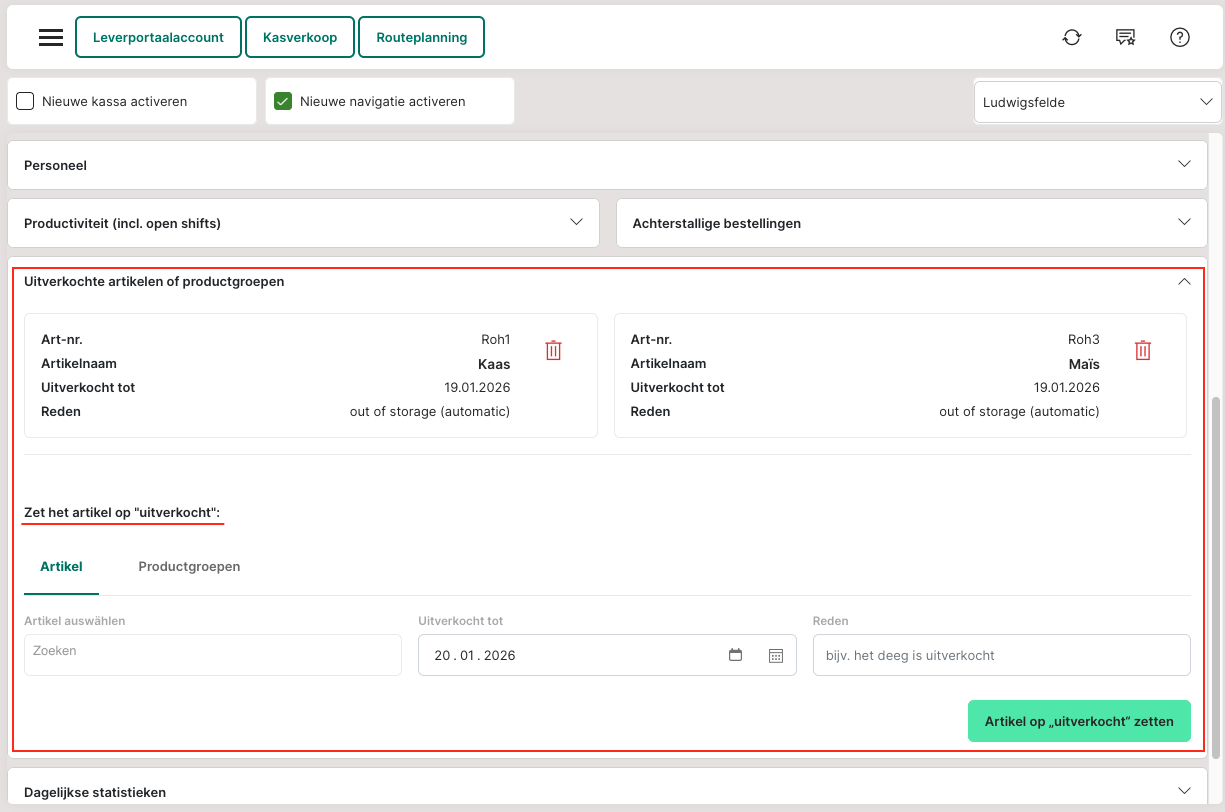 Op het dashboard kunnen onder "Uitverkochte artikelen of productgroepen" artikelen of productgroepen tot een bepaalde datum (bijv. tot de volgende dag) als "uitverkocht" worden gemarkeerd (onder Admin/POS: Dashboard). Zodra deze datum is bereikt, wordt het artikel automatisch weer als beschikbaar weergegeven.