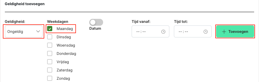 - Als er geen tijd wordt ingevuld, geldt de regel voor de hele dag (00:00–24:00).