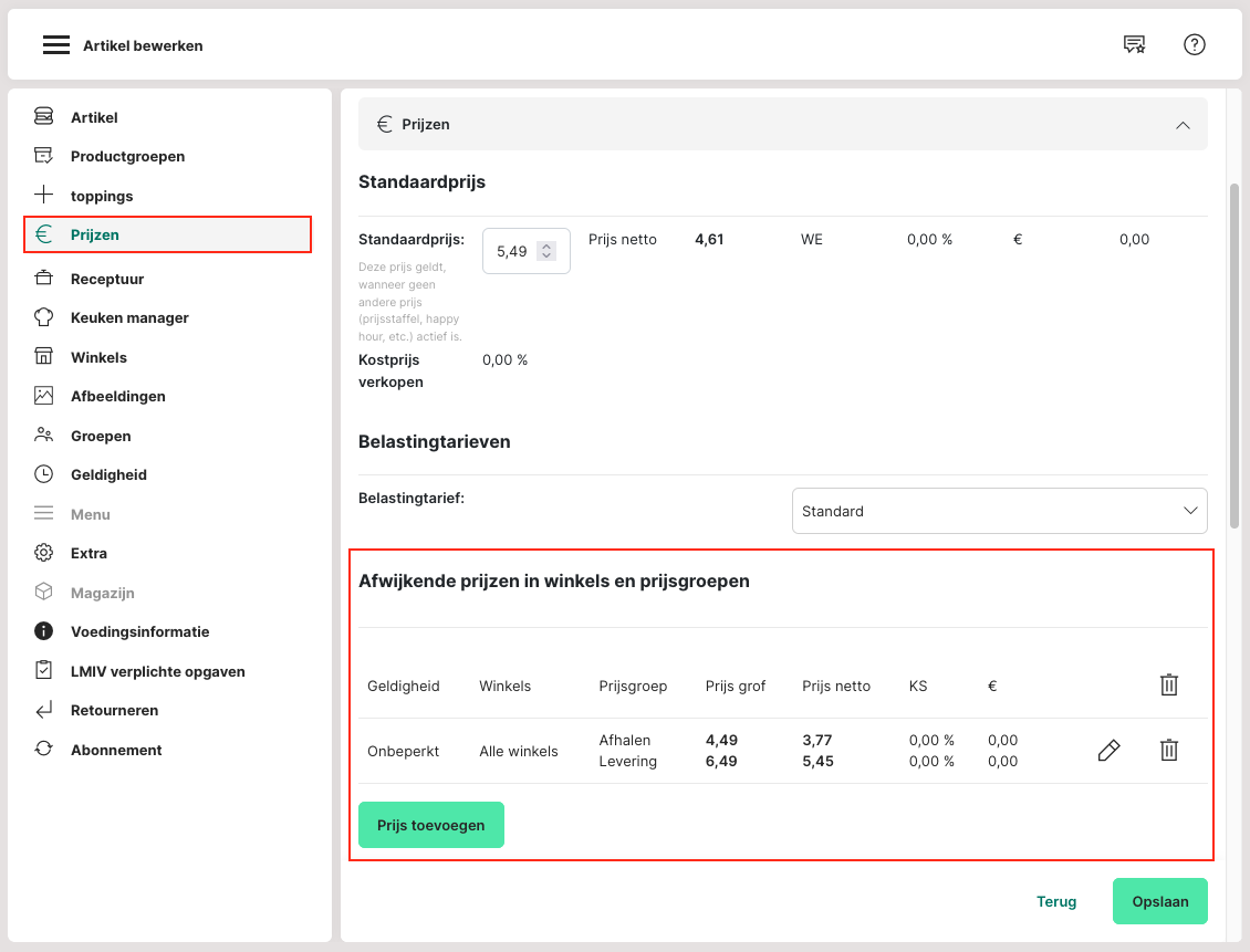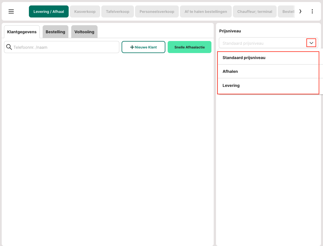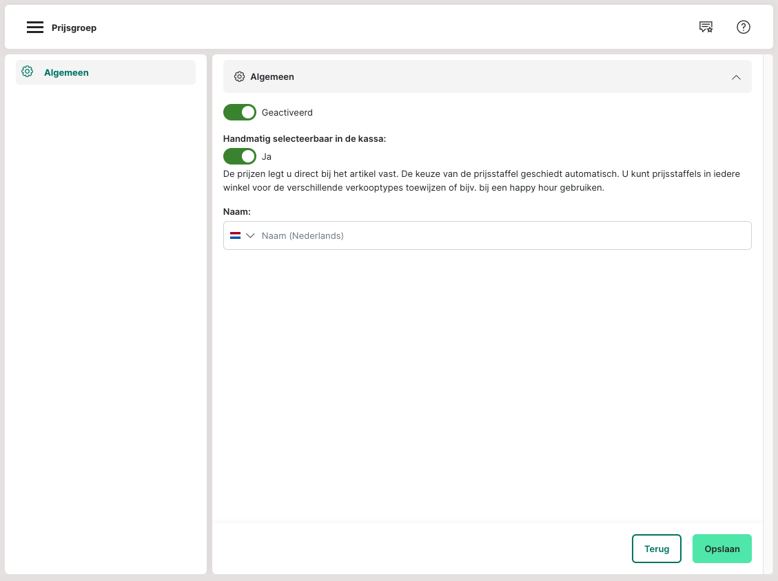 - Schakel optioneel de optie "Handmatig selecteerbaar in de kassa" in als de prijsgroep voor het opnemen van een bestelling in de POS/kassa gekozen moet kunnen worden.