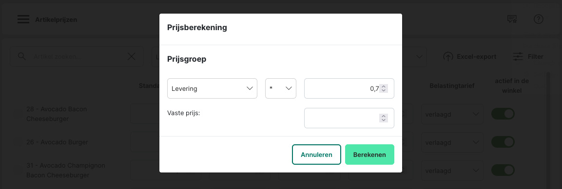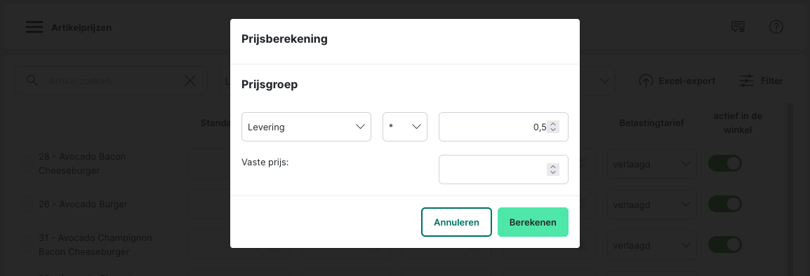 In plaats van een procentuele berekening kan hier ook een "vaste prijs" worden ingesteld voor alle artikelen, bijvoorbeeld €5, in welk geval €5 wordt ingevoerd in de hele kolom.