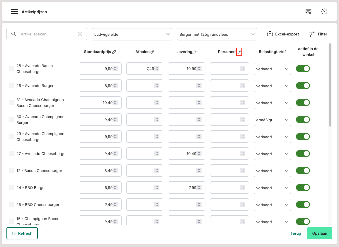 Als partner van een winkel is alleen je eigen winkel zichtbaar. Als het onderhoud van artikelen centraal wordt beheerd voor meerdere winkels, kun je kiezen tussen de winkels in het vervolgkeuzemenu bovenaan. De prijzen kunnen echter alleen voor elke winkel afzonderlijk worden opgeslagen. Als dezelfde prijs voor meerdere winkels tegelijk moet worden ingevoerd, kan dit alleen binnen de artikelstamgegevens (Admin: Artikelen beheren > Artikel > Bewerken > Prijzen).