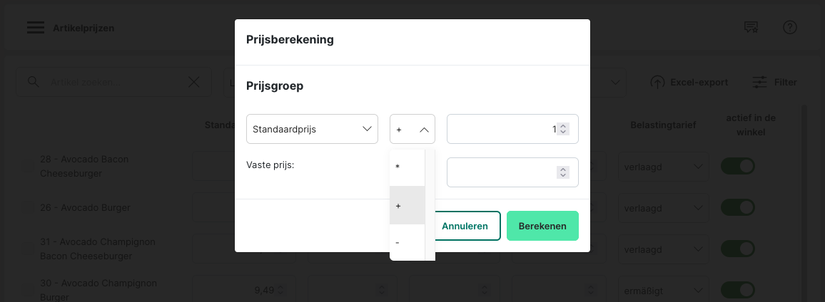 Naast de "vermenigvuldiging" kan er ook een "optelling" of "aftrekking" van een specifieke waarde worden uitgevoerd. Bijvoorbeeld: Als er een toeslag van €1 moet worden toegevoegd aan de standaardprijs voor "Levering", klik dan op de knop "Bewerken" voor "Levering", selecteer de "Standaardprijs", selecteer het "Toevoegingssymbool" ("+") en voer het getal 1 in. Hierdoor wordt automatisch een bedrag van €1 toegevoegd aan de prijs in de kolom "Levering", gebaseerd op de standaardprijs.