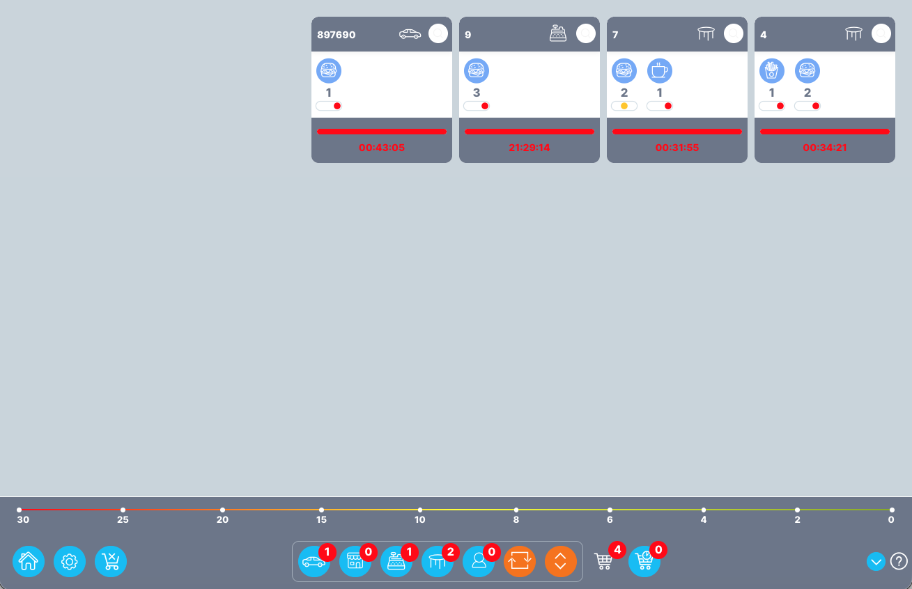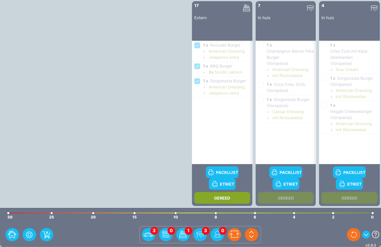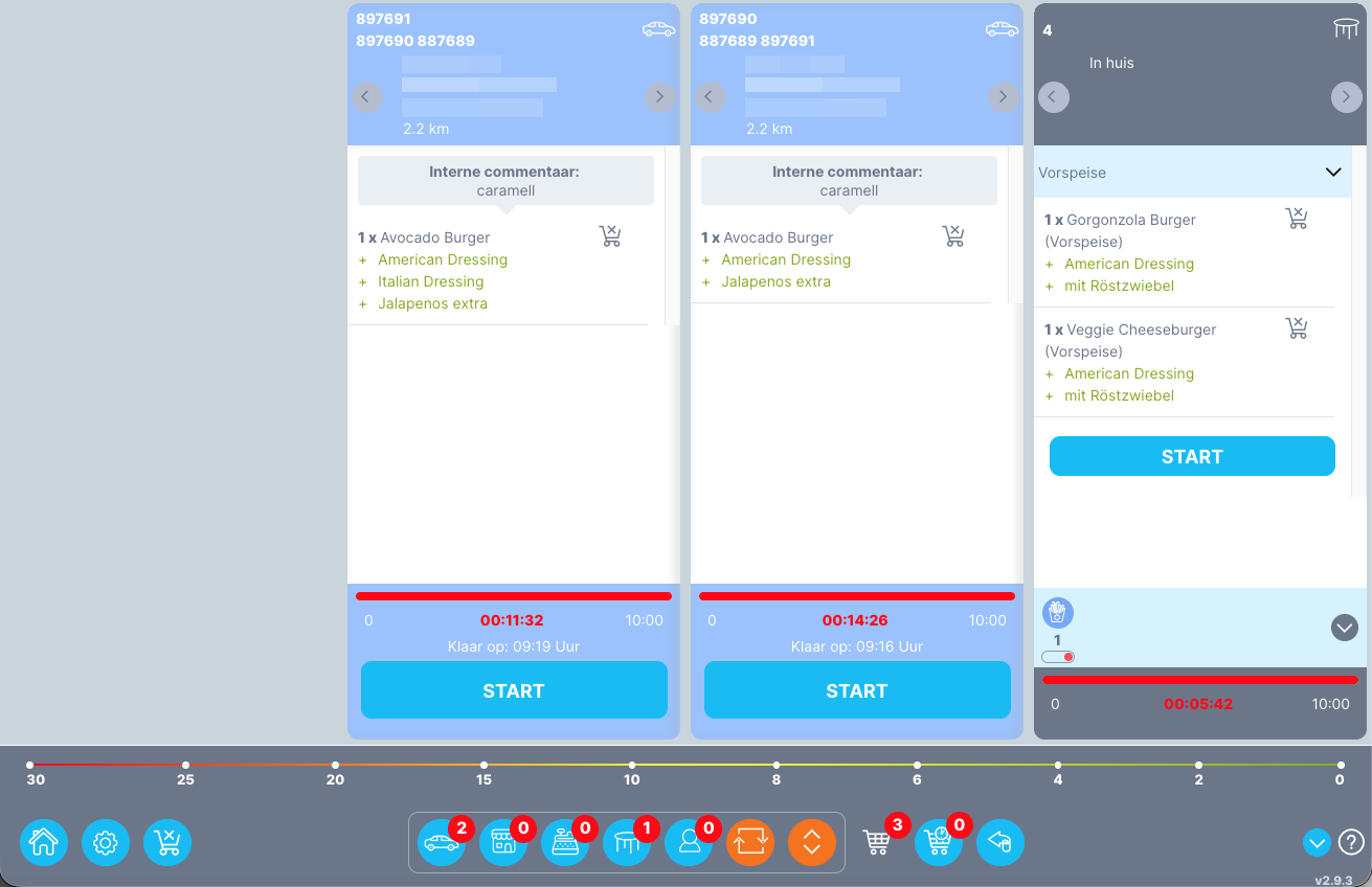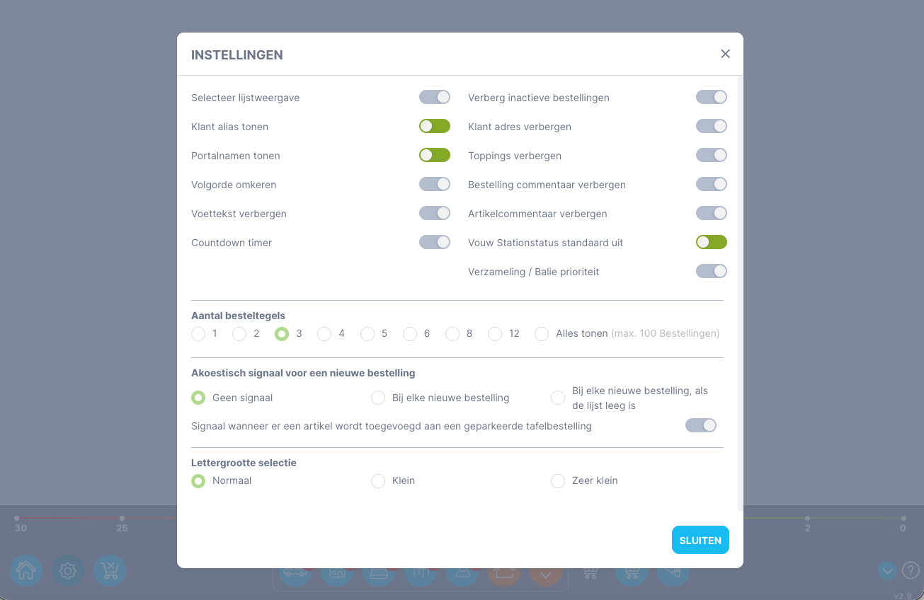 Voettekst | De voettekst van de klantenmonitor bevat de instelling en de filteroptie. De filteroptie filtert de bestellingen volgens hun type, b.v. levering, afhaling, enz. De instellingsoptie bevat verschillende functies, zoals het wijzigen van de lettergrootte, het aanpassen van het geluidssignaal voor nieuwe bestellingen en het verbergen of tonen van de voettekst. |