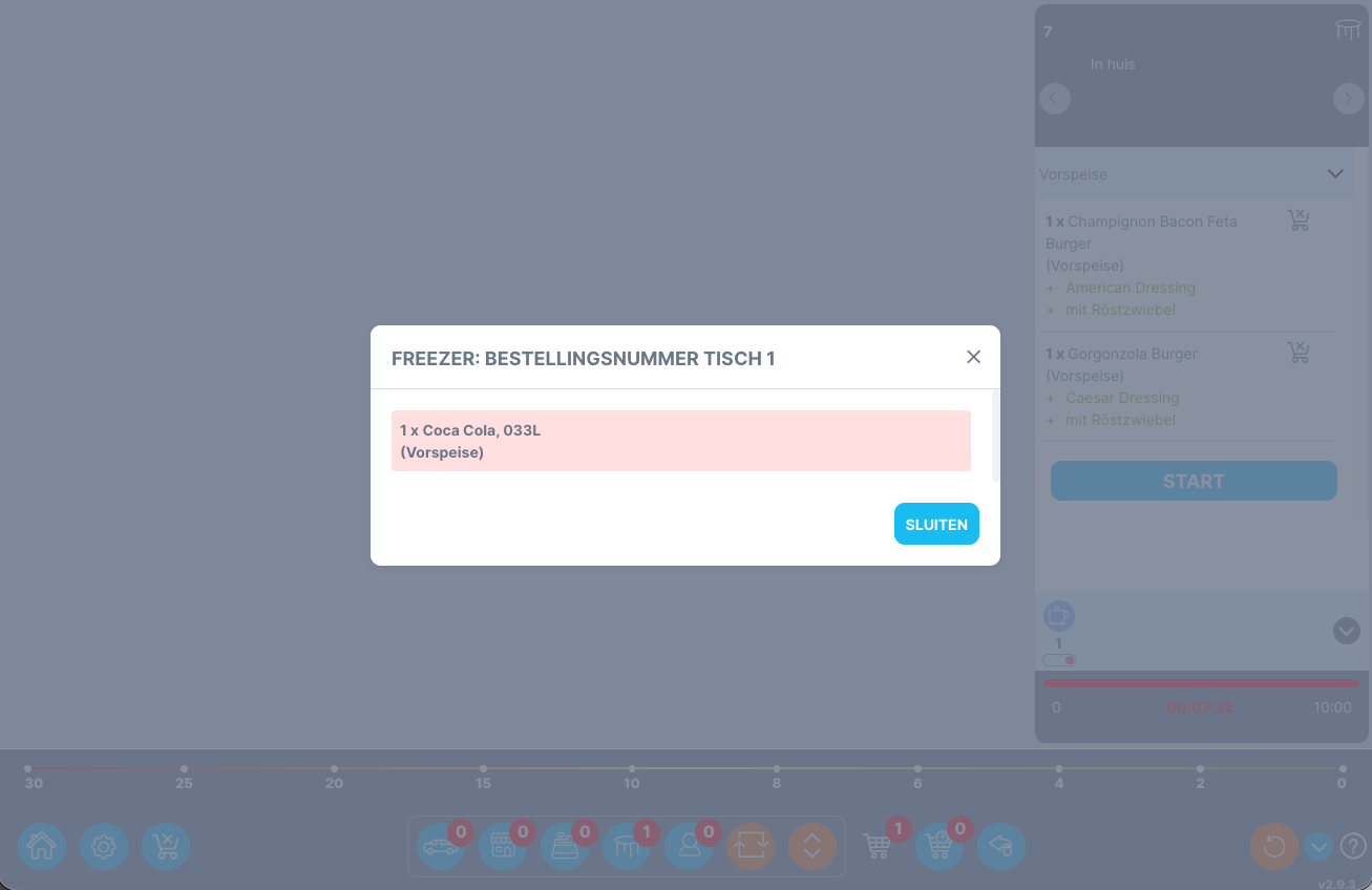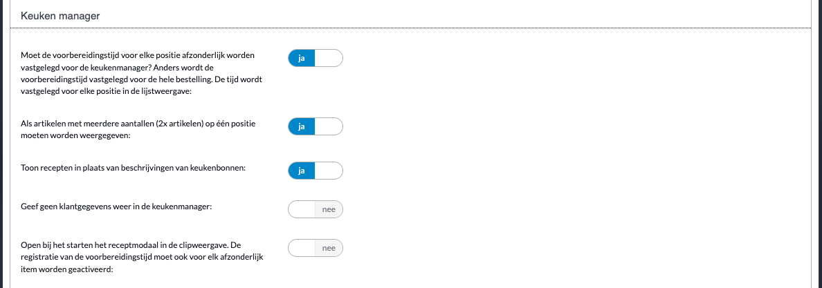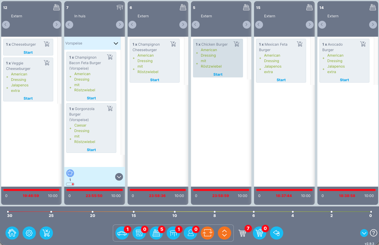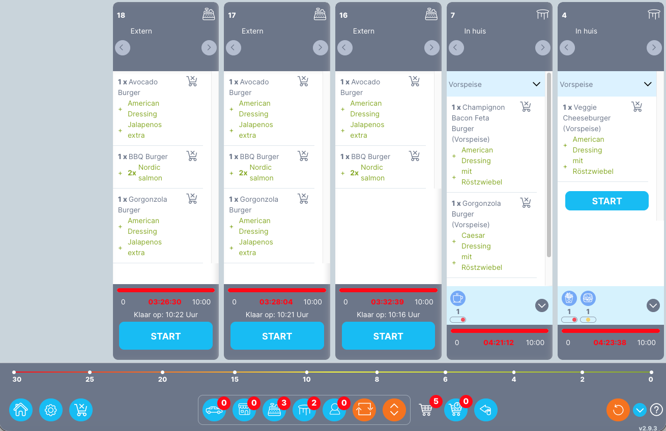 Selecteer lijstweergave | Hier kunt u schakelen tussen de vooringestelde tegelweergave en de lijstweergave. Tegel uitzicht: Indien gewenst kan de productie per order worden opgestart. Dit kan worden ingesteld in Admin > Winkel > Algemene winkelinstellingen > Overige instellingen > onder Keuken manager > Moet de voorbereidingstijd voor elke positie afzonderlijk worden vastgelegd voor de keukenmanager? Anders wordt de voorbereidingstijd vastgelegd voor de hele bestelling. De tijd wordt vastgelegd voor elke positie in de lijstweergave: