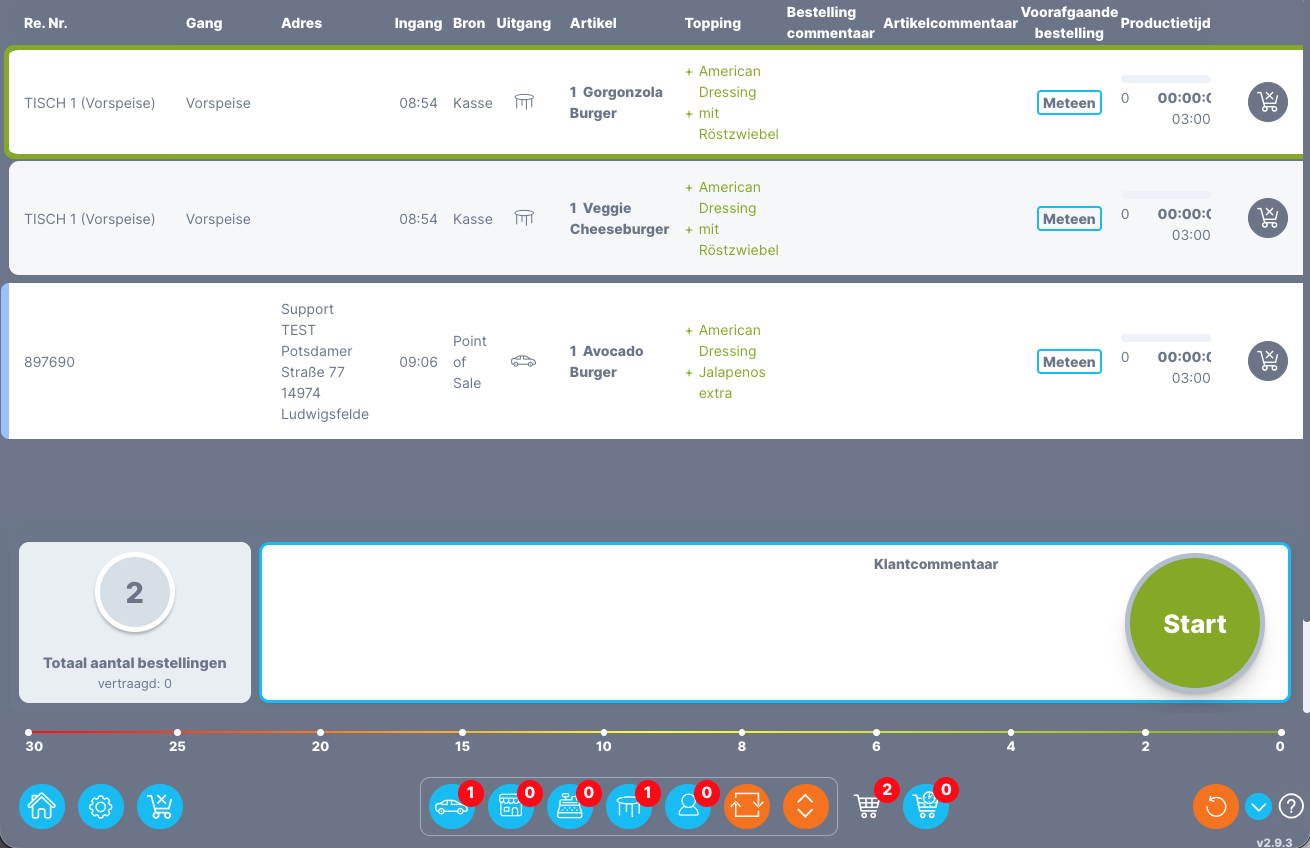 Lijstweergave: Alle producten kunnen afzonderlijk worden gestart voor productie en er is een grote start/finish-knop, evenals beknopte statistieken over ontvangen orders. |