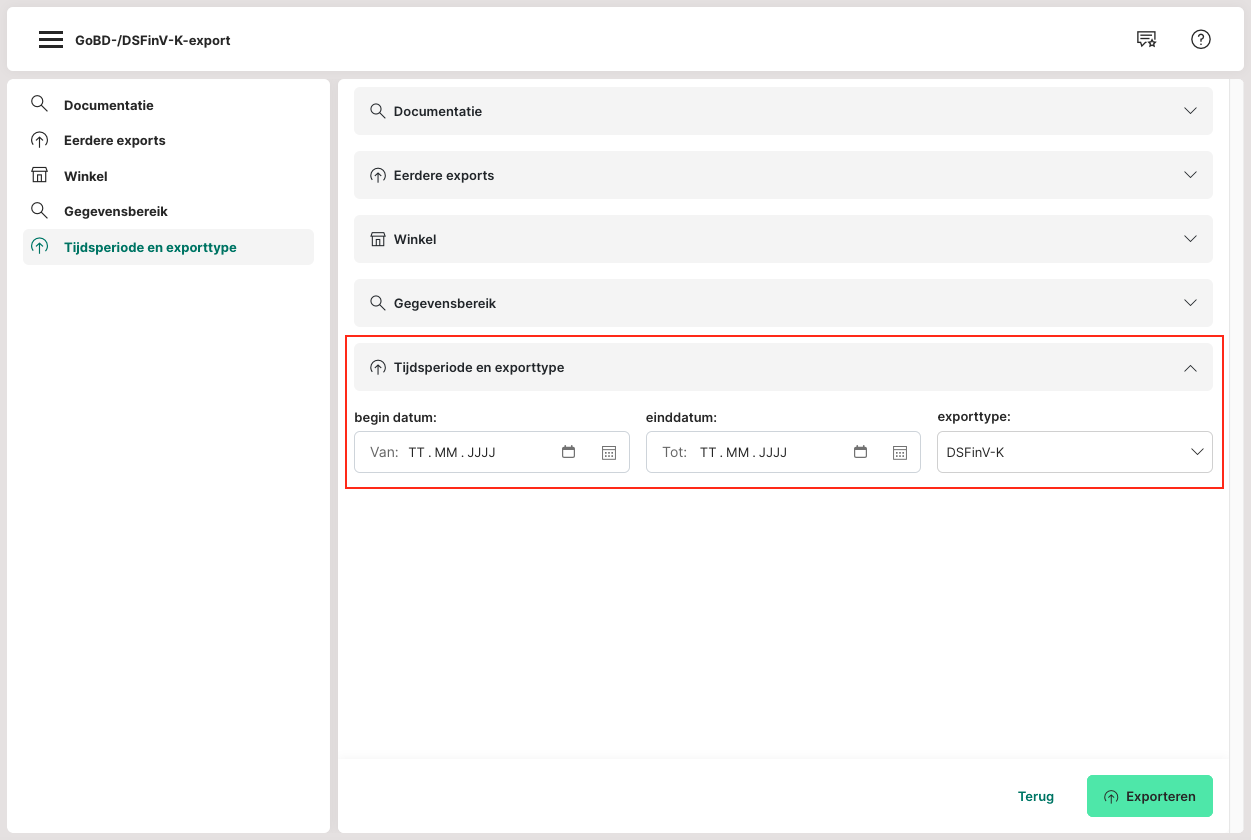 - Selecteer onder "Tijdsperiode en exporttype" de periode waarvoor je wordt gecontroleerd: