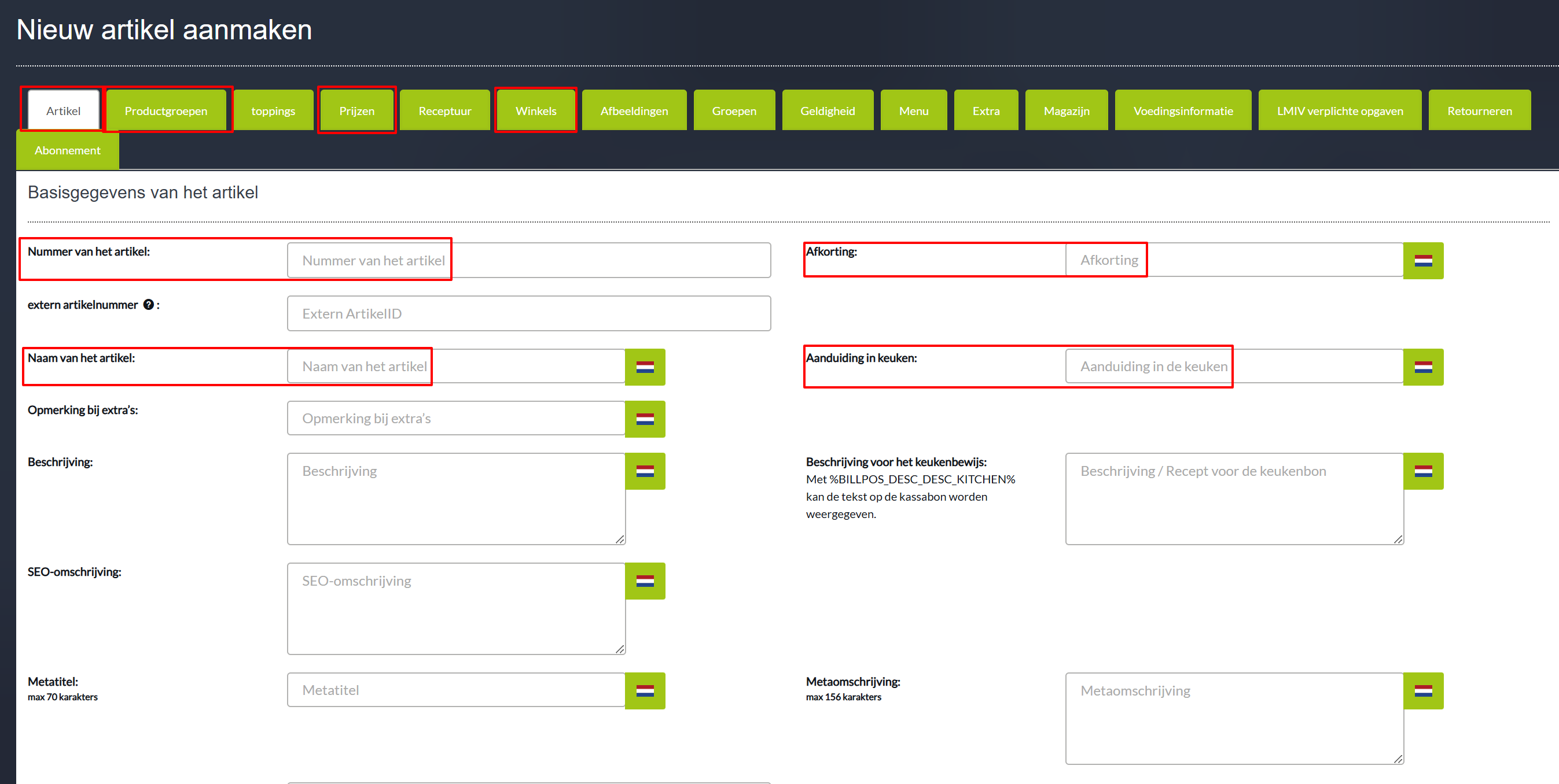 in: Nummer van het artikel, Naam van het artikel, Afkorting, Aanduiding in keuken, Verkoopartikel, Productgroepen, Prijzen en Winkels.
