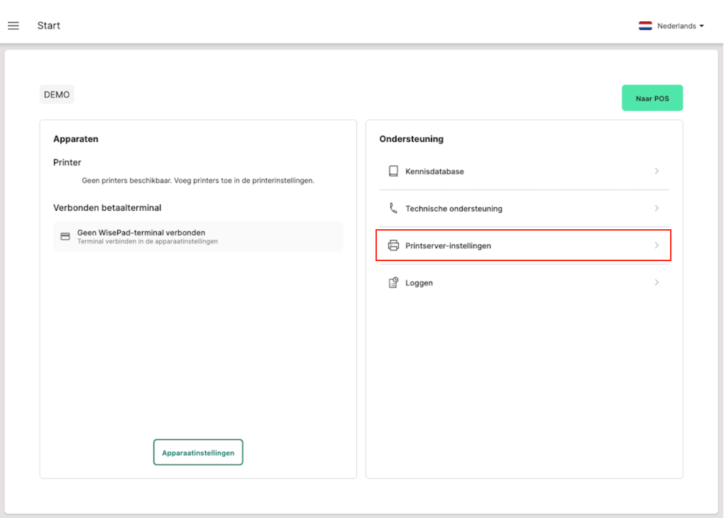 Op de startpagina kun je de printserverinstellingen openen via het menu-item "Printserverinstellingen".