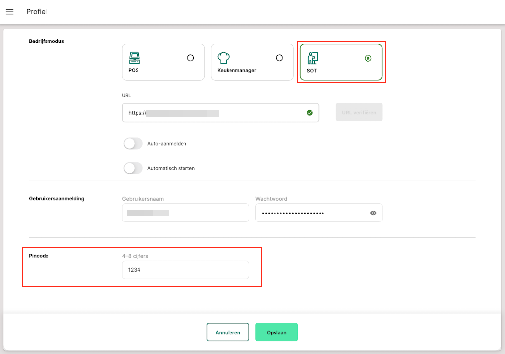 Daarnaast kun je hier inloggegevens opslaan, automatische startopties configureren en in self-ordering-terminal (SOT)-modus een PIN instellen om de kioskmodus te ontgrendelen.