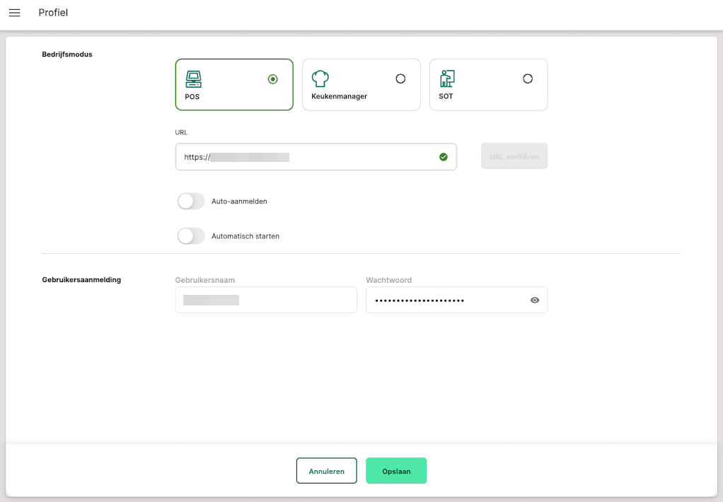 het profielgebied van de Restaurant POS-app kun je de bedrijfsmodus van