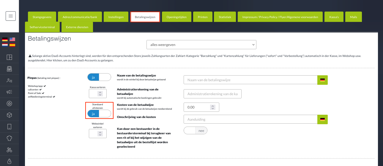- Standaard betaalmethode: "Pinpas"