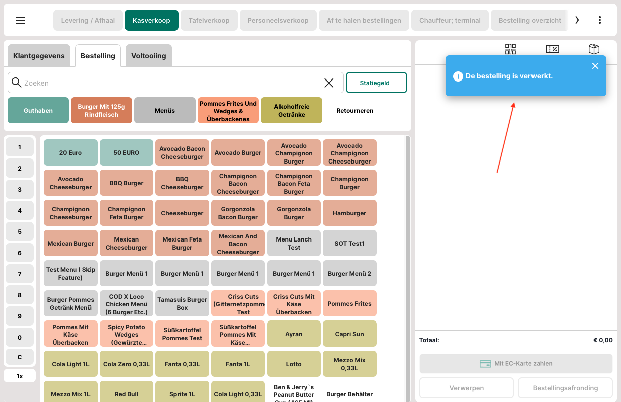 In de artikelweergave bij de kassa wordt rechtsonder een extra knop weergegeven om de bestelling af te ronden.