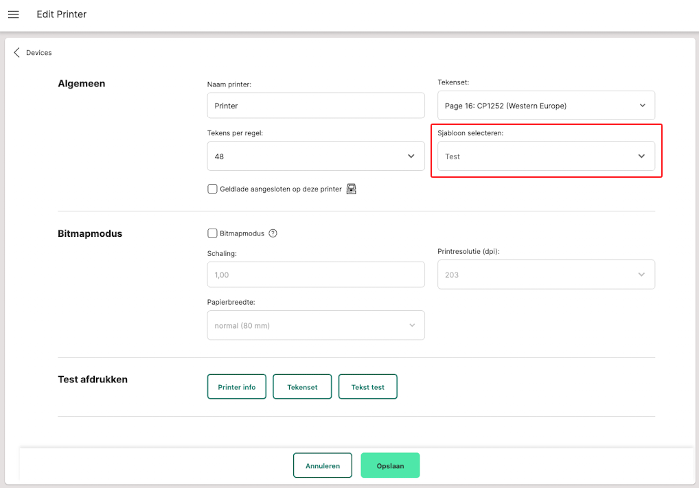 5. Selecteer een sjabloon. Voer indien nodig een testafdruk uit onder "Test afdrukken" om de printerverbinding te controleren. Klik vervolgens op "Opslaan".