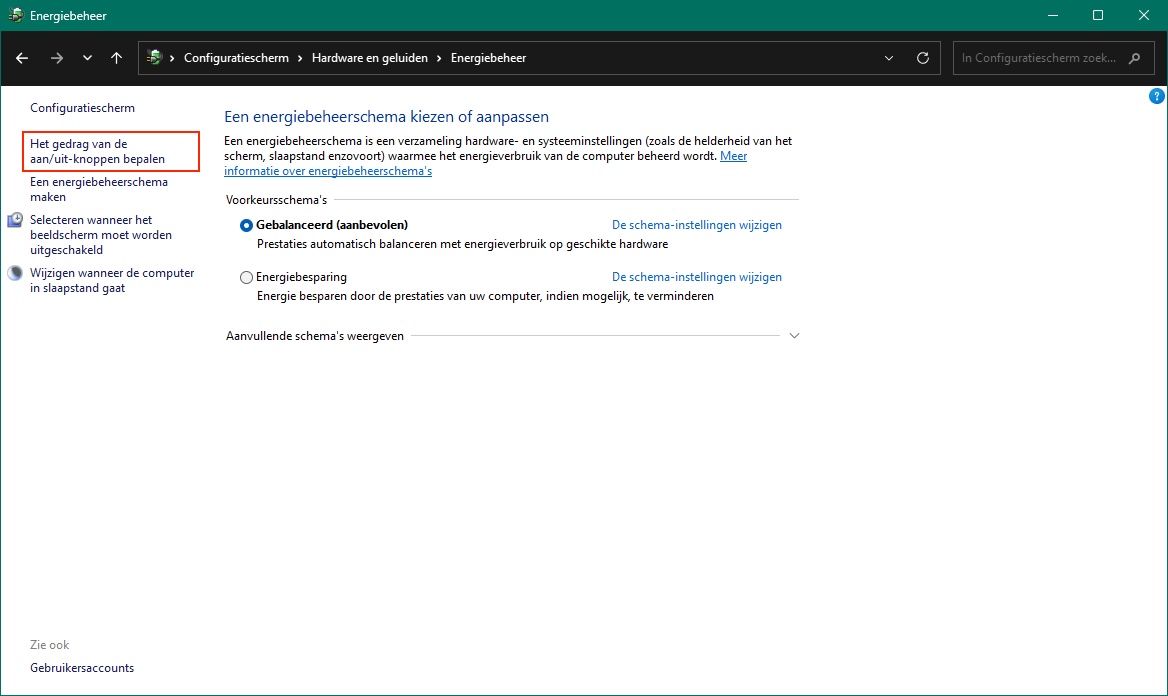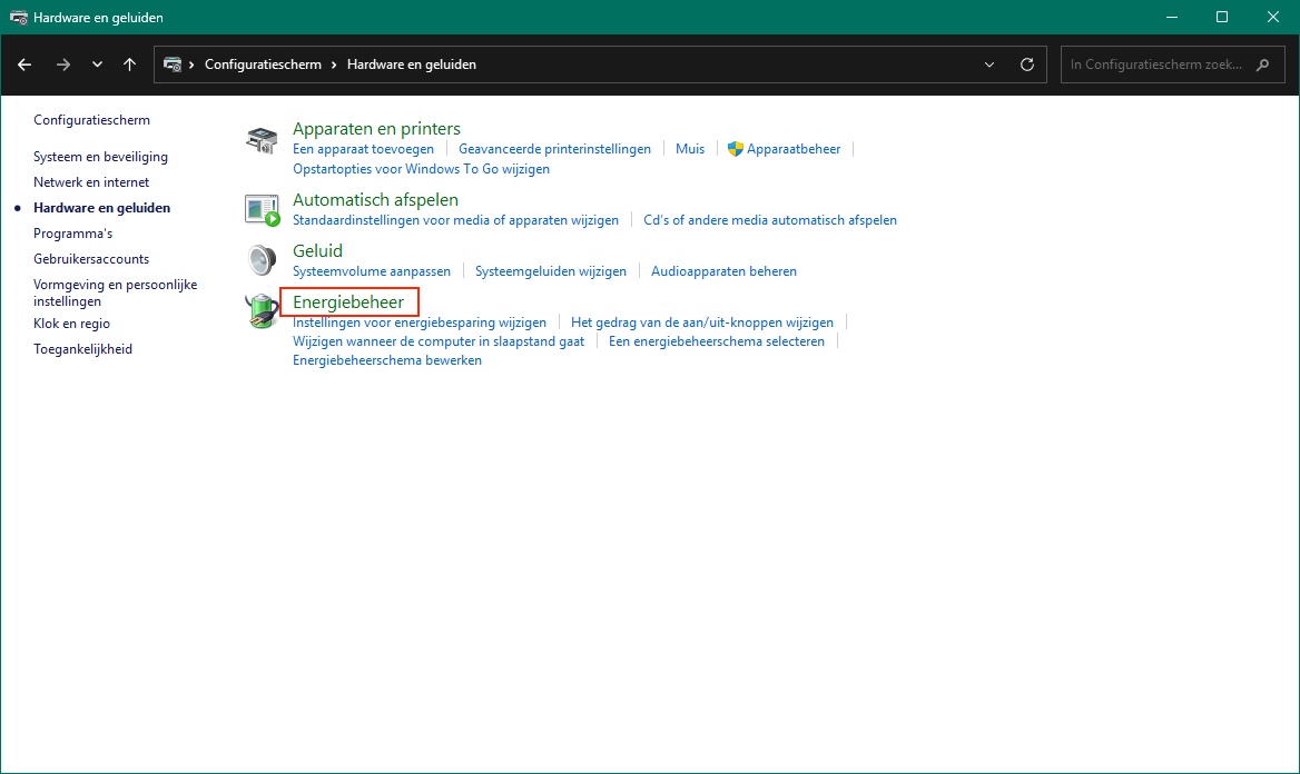 Configuratiescherm > Hardware en geluiden > Energiebeheer >