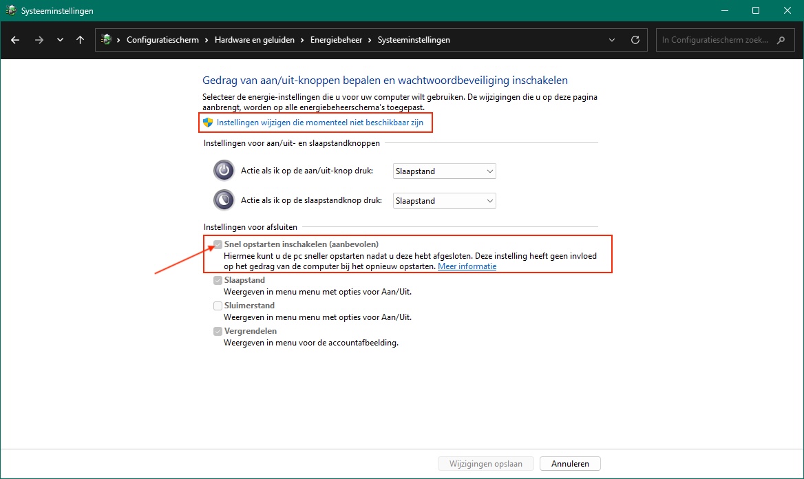 momenteel niet beschikbaar zijn > Vink "Snel opstarten inschakelen