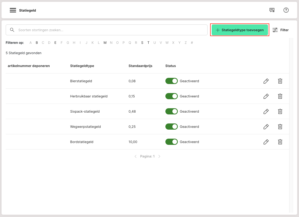 - Klik rechtsboven op "Statiegeldtype toevoegen".