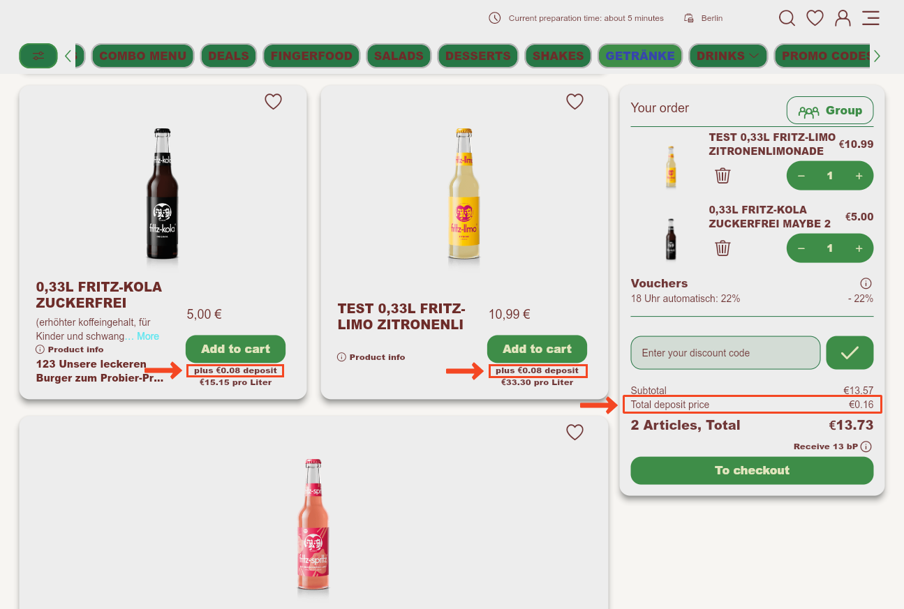 - Menukeuze en winkelwagen: Het statiegeld wordt direct bij elk afzonderlijk artikel weergegeven en in de winkelwagen als een extra, aparte regel per artikel vermeld.