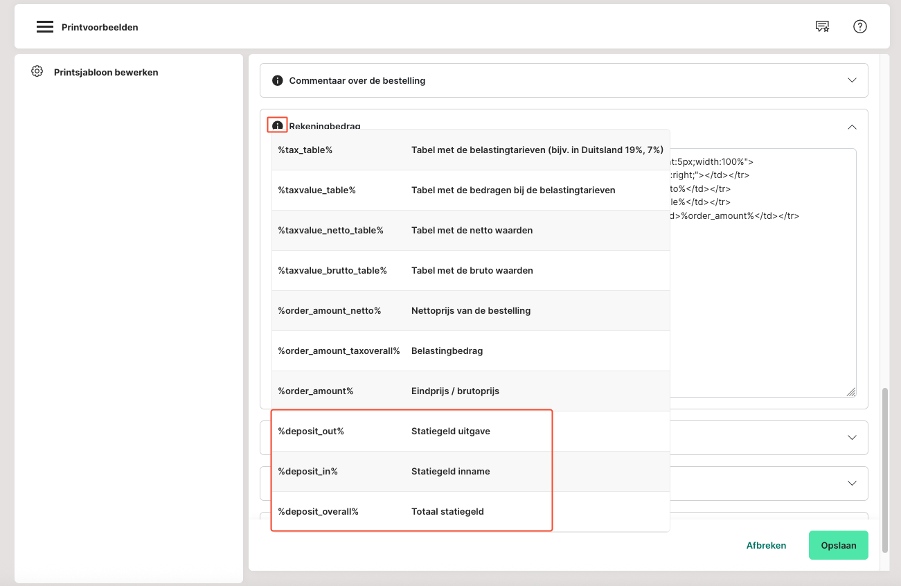 Hiervoor zijn de volgende placeholders beschikbaar onder Admin: Hardware > Printvoorbeelden > Bewerken > Rekeningbedrag.