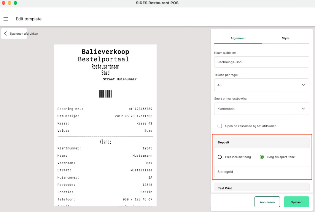 In de Restaurant POS-app kan in de afdrukvoorbeelden worden bepaald of het statiegeld als inclusief of als afzonderlijke positie moet worden weergegeven (onder Restaurant POS-app: zijmenu > Sjablonen afdrukken > Bewerken > Statiegeld).