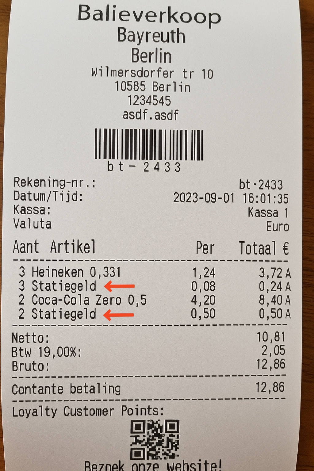 Als bijvoorbeeld "Borg als apart item" wordt geselecteerd, wordt het statiegeld apart op de bon vermeld.
