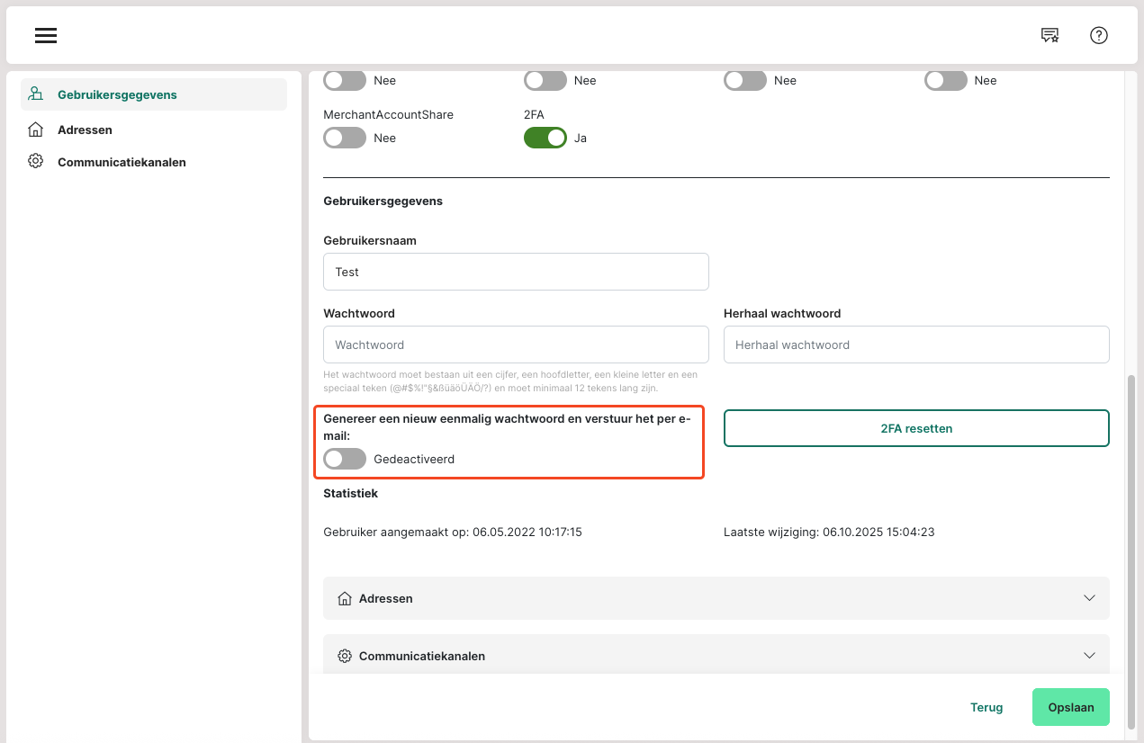 Als een gebruiker zijn wachtwoord is vergeten of geen toegang meer heeft tot zijn account, kun je een nieuw eenmalig wachtwoord genereren en naar het opgegeven e-mailadres verzenden.