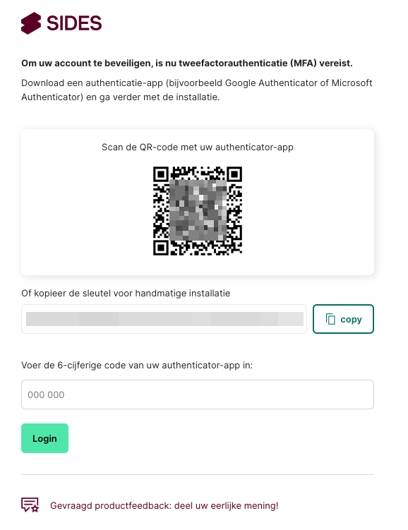 Opmerking: gebruikers die tot de 2FA-groepen behoren, worden bij de volgende aanmelding gevraagd om 2FA in te stellen. Aanmelden bij het systeem is niet mogelijk totdat de installatie met succes is voltooid.
