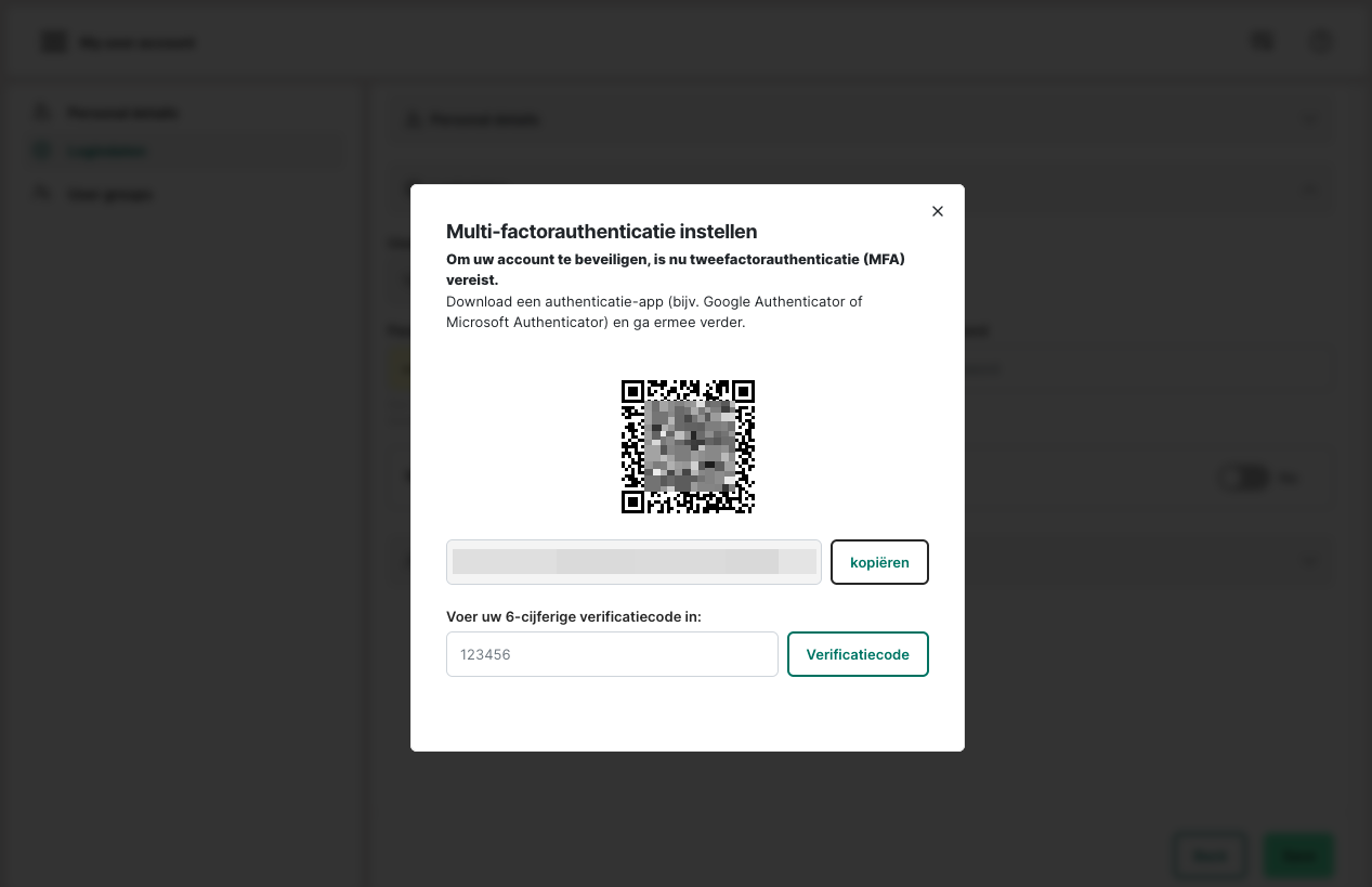 - Verplicht: een beheerder wijst je de gebruikersgroep "2FA" toe → dan moet je 2FA instellen bij de volgende keer dat je inlogt.