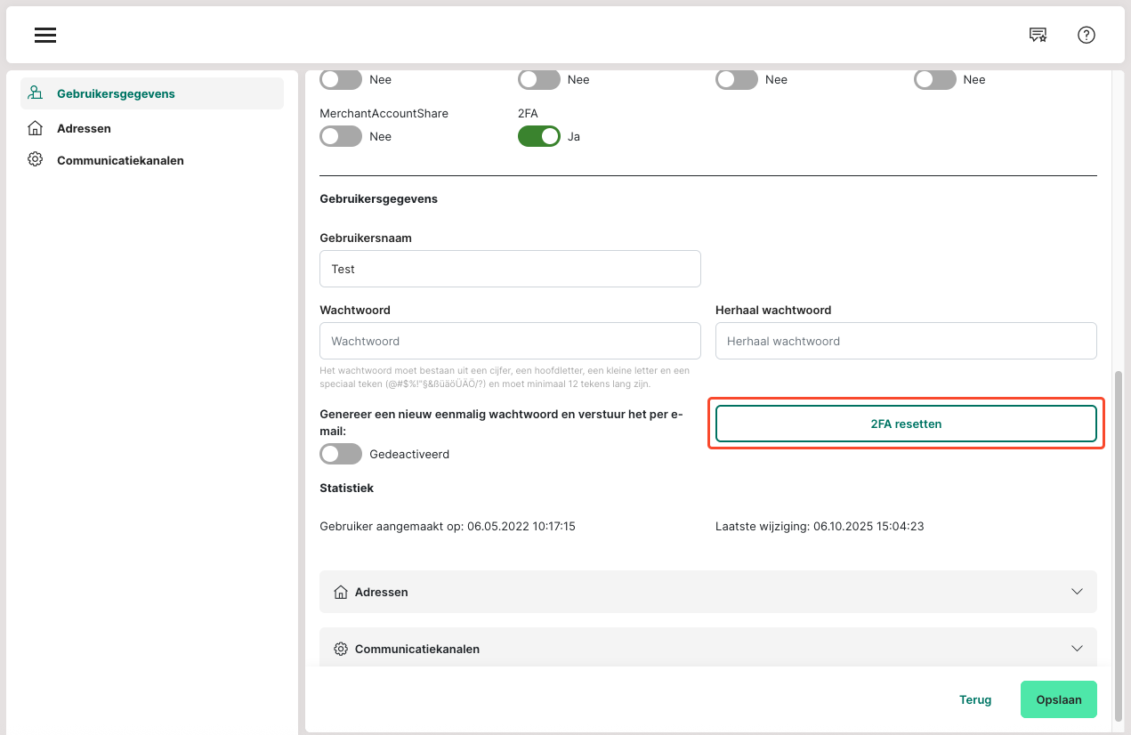 Als een gebruiker geen toegang heeft tot zijn authenticator of back-upcodes, kan 2FA voor deze gebruiker worden gereset in het gebruikersbeheer. De gebruiker wordt bij de volgende aanmelding gevraagd om 2FA opnieuw in te stellen.