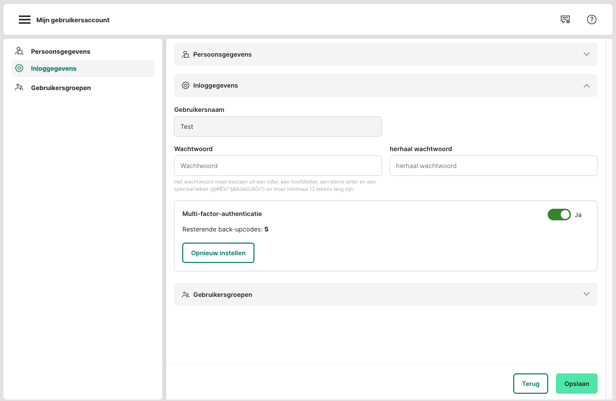 - Vrijwillig: je kunt 2FA zelf activeren of deactiveren in je profielinstellingen (tenzij het verplicht is ingesteld) en ook opnieuw instellen, bijvoorbeeld om nieuwe back-upcodes aan te maken.