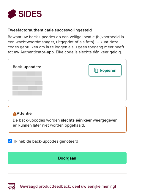 - Vink het vakje "Ik heb de back-upcodes genoteerd" aan en klik op "Doorgaan".
