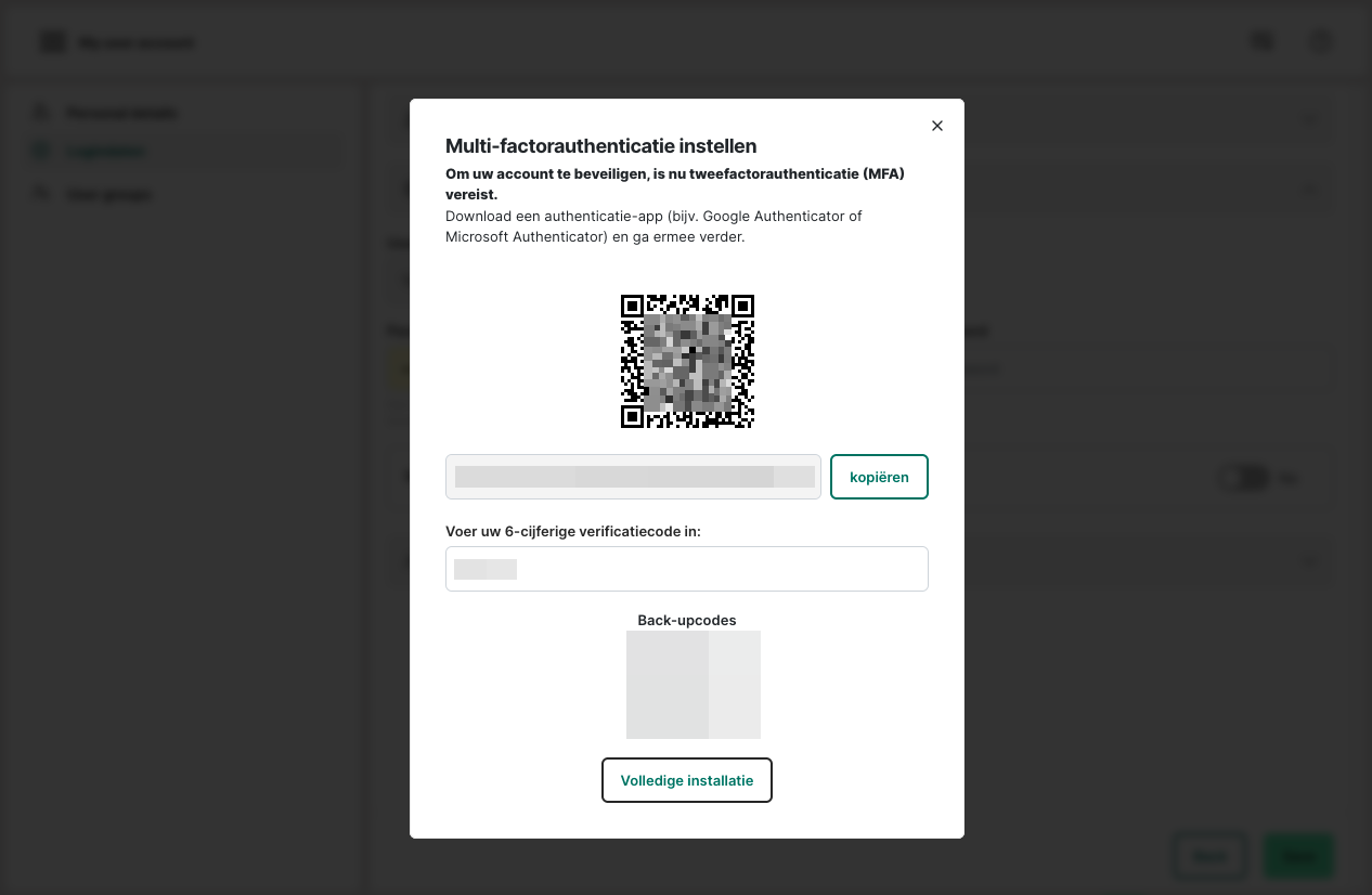 - Back-upcodes kwijt → Start de installatie opnieuw in de profielinstellingen of neem contact op met een beheerder