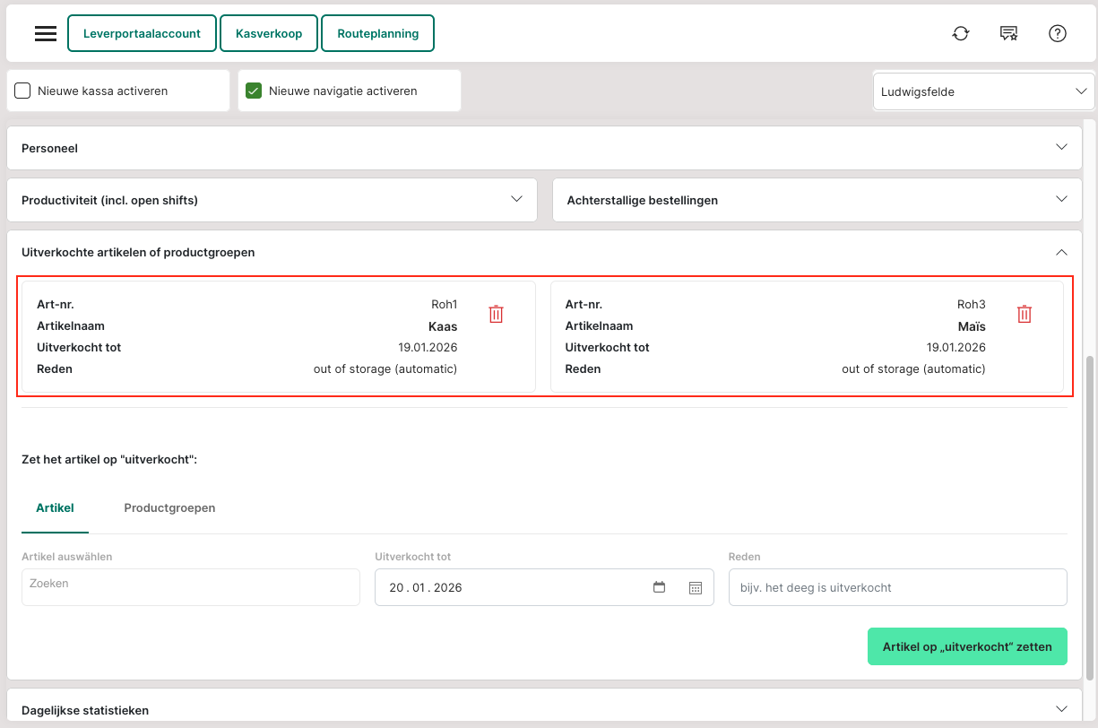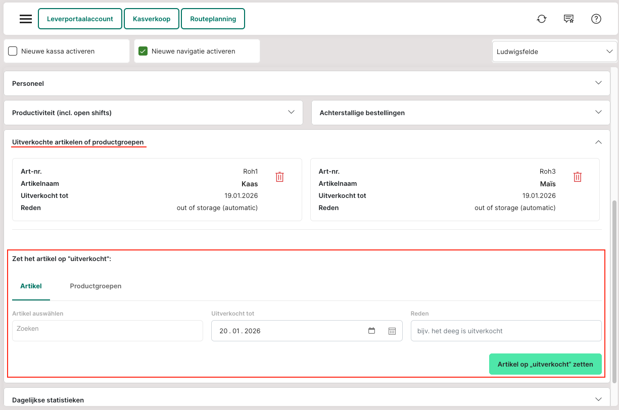 In het dashboard kunnen onder "Uitverkochte artikelen of productgroepen" artikelen of productgroepen tot een bepaalde datum (bijv. tot de volgende dag) als "uitverkocht" worden gemarkeerd. Dit voorkomt dat deze artikelen gekocht kunnen worden.