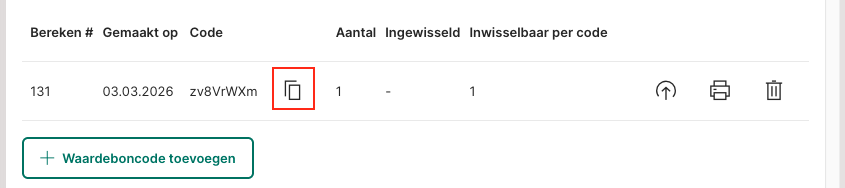 Als de link in de algemene winkelinstellingen is ingevoerd, kan de waardebon worden aangemaakt. Wanneer de waardebon is aangemaakt en opgeslagen, wordt de waardebon opnieuw geopend en wordt op de knop "Naar buffer kopiëren" geklikt. Dan staat de waardeboncode samen met de webshop-URL in het klembord en kan bijvoorbeeld in een Word-document of nieuwsbrief worden geplakt.