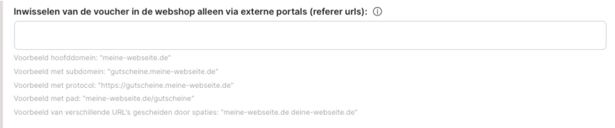 Inwisselen van de waardebon in de webshop alleen via externe portals (referrer urls): Hier kunnen referrer-URL's (meerdere gescheiden door spaties) worden ingevoerd via externe (eventueel uw eigen) URL's/providers, die bij het inwisselen van de waardebon worden gecontroleerd . Dit kan ook de veiligheid van de codes vergroten of het gebruik ervan beter volgen. De waardebon kan dan alleen via de waardebon-URL in de webshop worden ingewisseld als de waardebon-URL wordt benaderd via de hier ingevulde URL's. De waardebon is dan niet meer in te wisselen in de app.