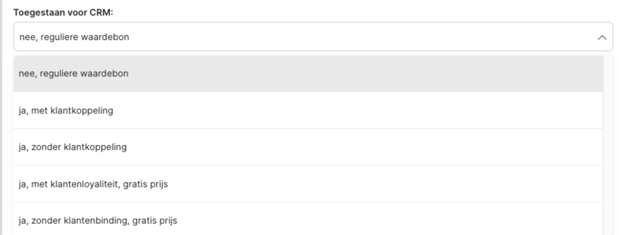 Ja, met klantkoppeling: Als deze instelling geselecteerd is, is de aangemaakte Waardebon een CRM bon. De klant moet ALTIJD ingelogd zijn bij het inwisselen van de Waardebon, anders kan de Waardebon niet gebruikt worden.